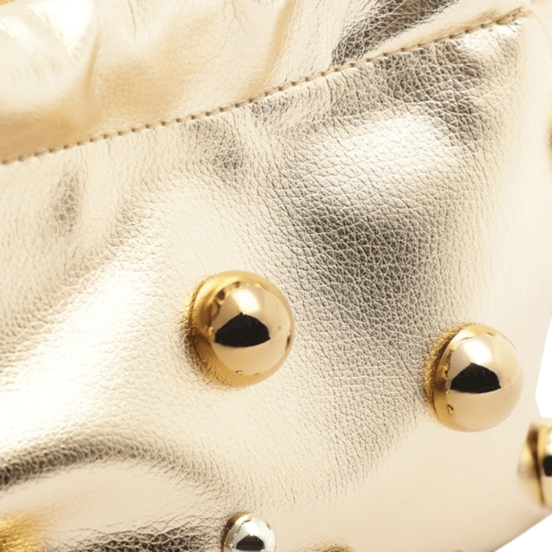 Detalhes: Aplicação de maxi studs metálicos em ouro e níquel na parte frontal