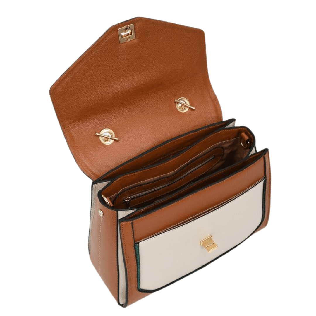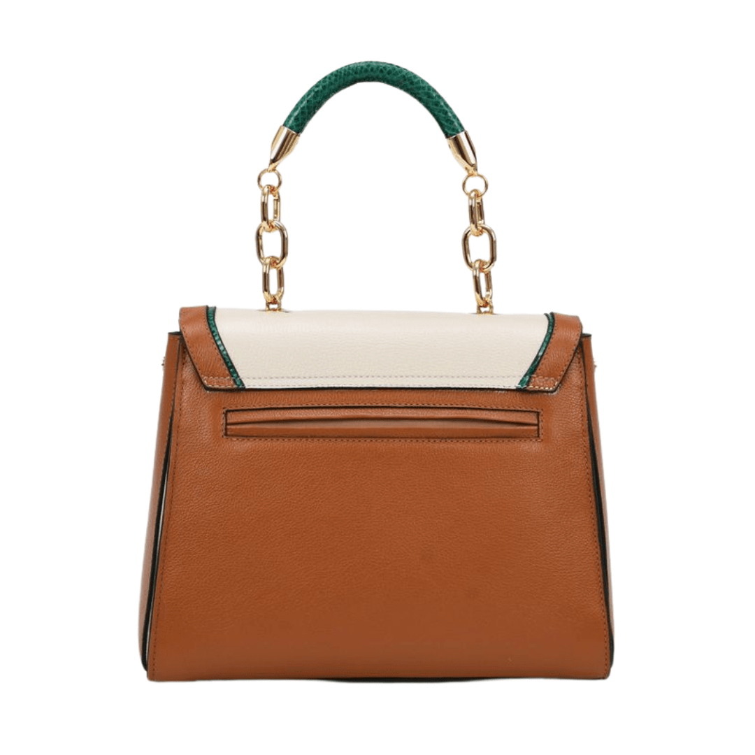 Acabamento: Corpo da bolsa em marrom, nude e detalhes em verde.