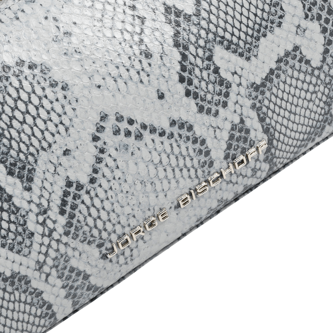 Detalhes metálicos: logotipo JORGE BISCHOFF e puxador de zíper com iniciais JB — ambos em metal grafite.