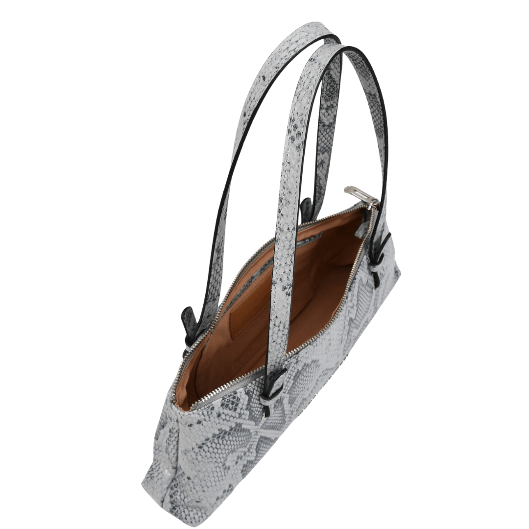 A textura snake e a cor azul hortênsia, tendência da temporada, conferem frescor e impacto visual, tornando este modelo indispensável para quem ama moda com identidade.