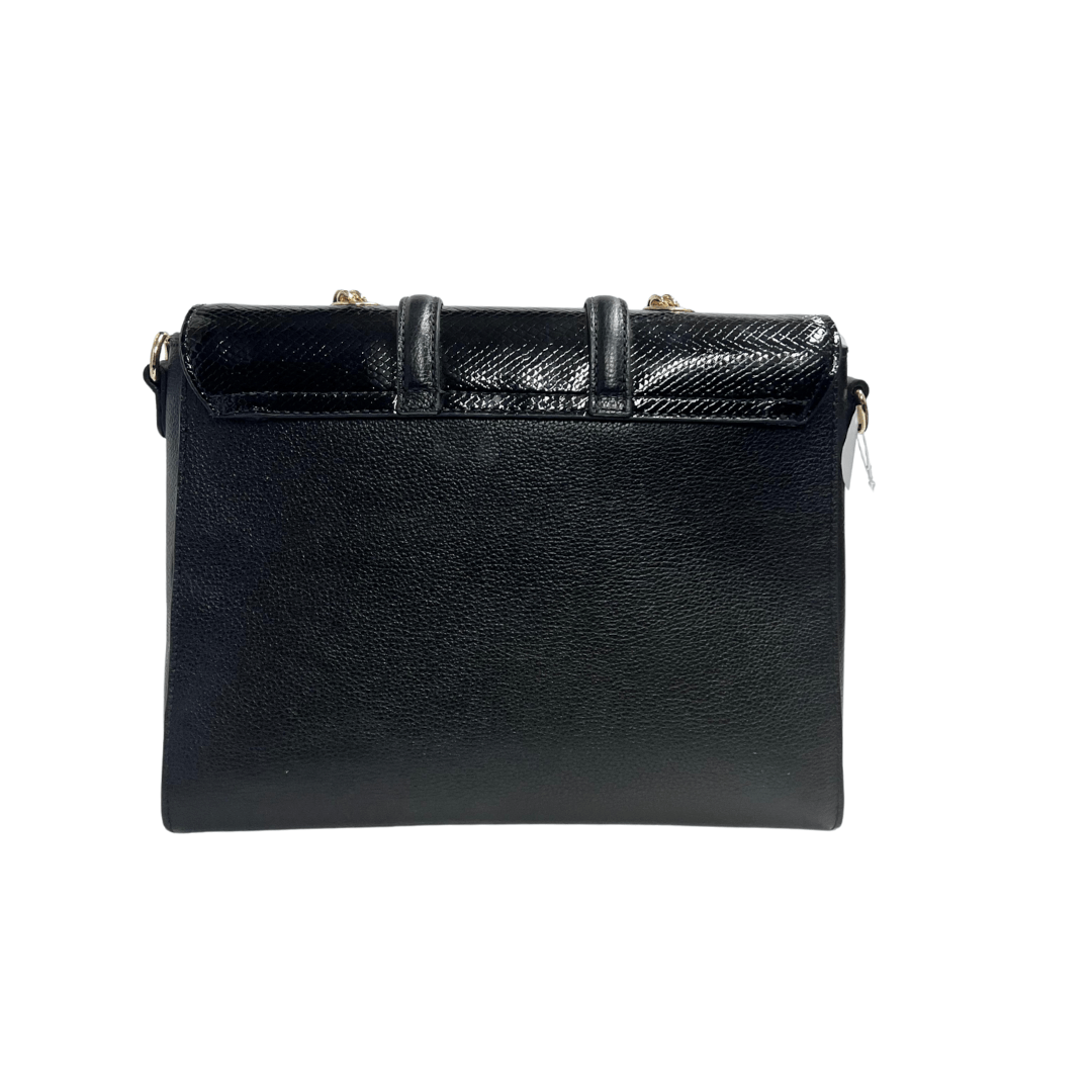 Fechamento com aba frontal e detalhe metálico com a logo da marca em dourado.
