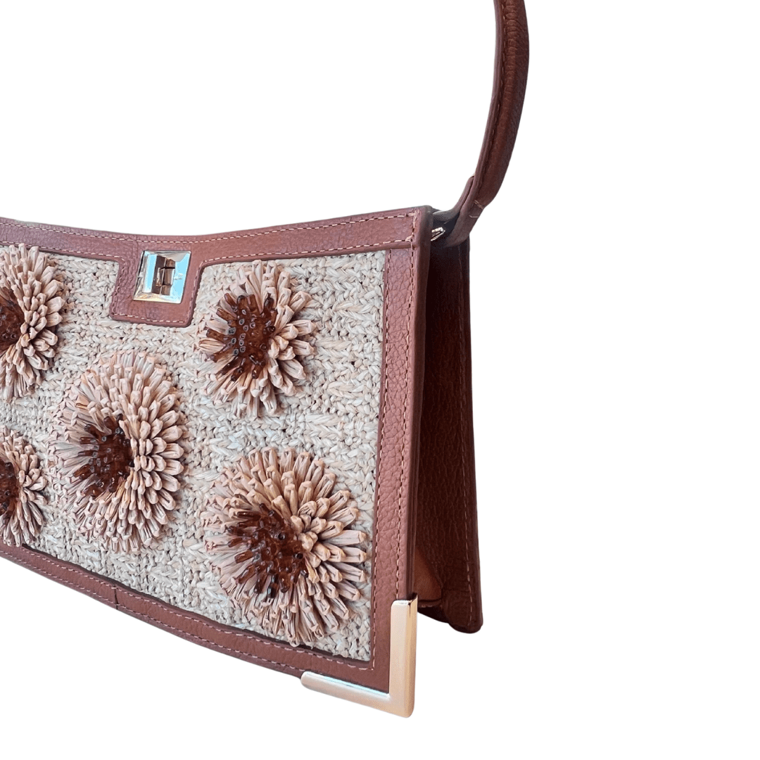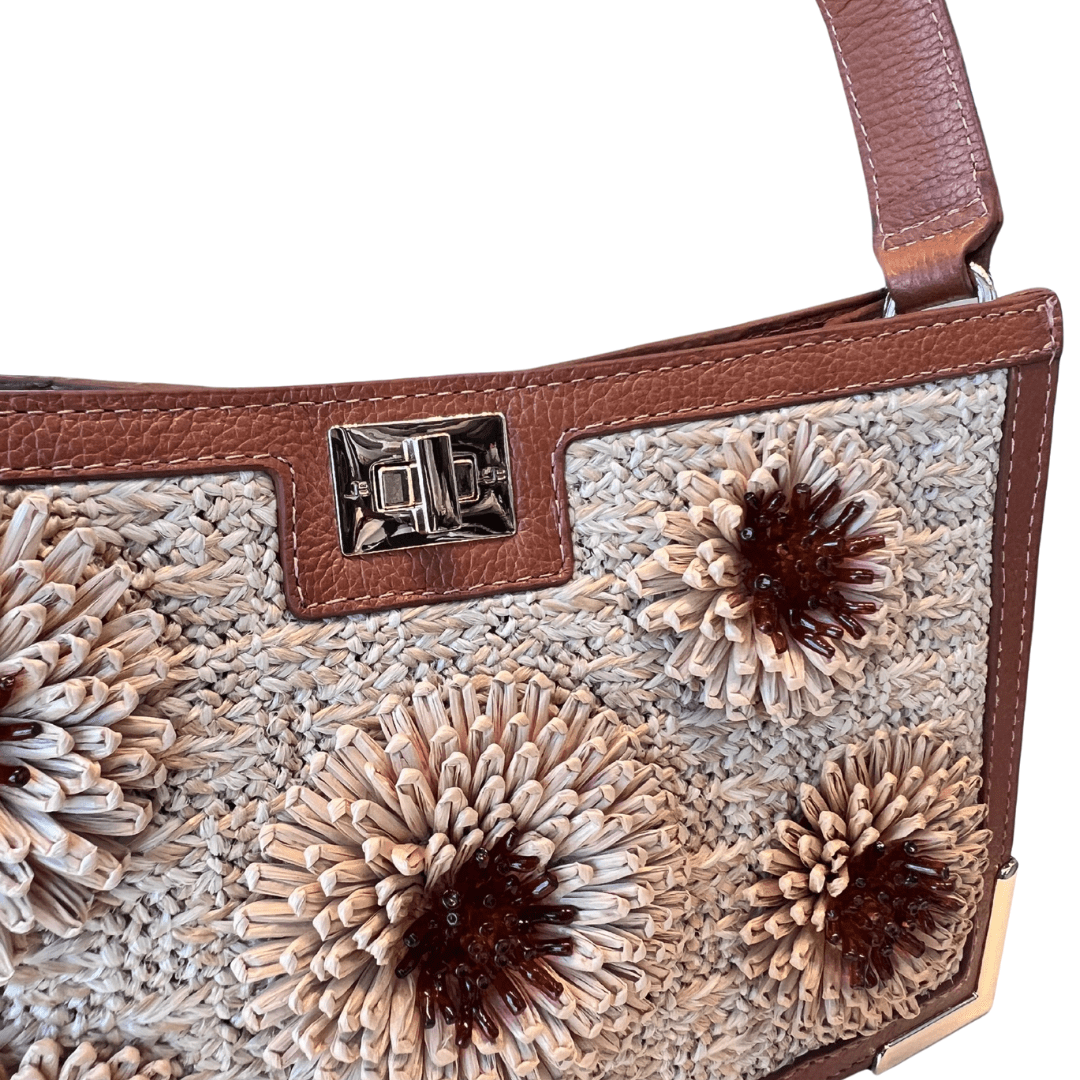 Detalhes frontais: Aplicações florais em ráfia bege com miolo marrom, em alto-relevo.