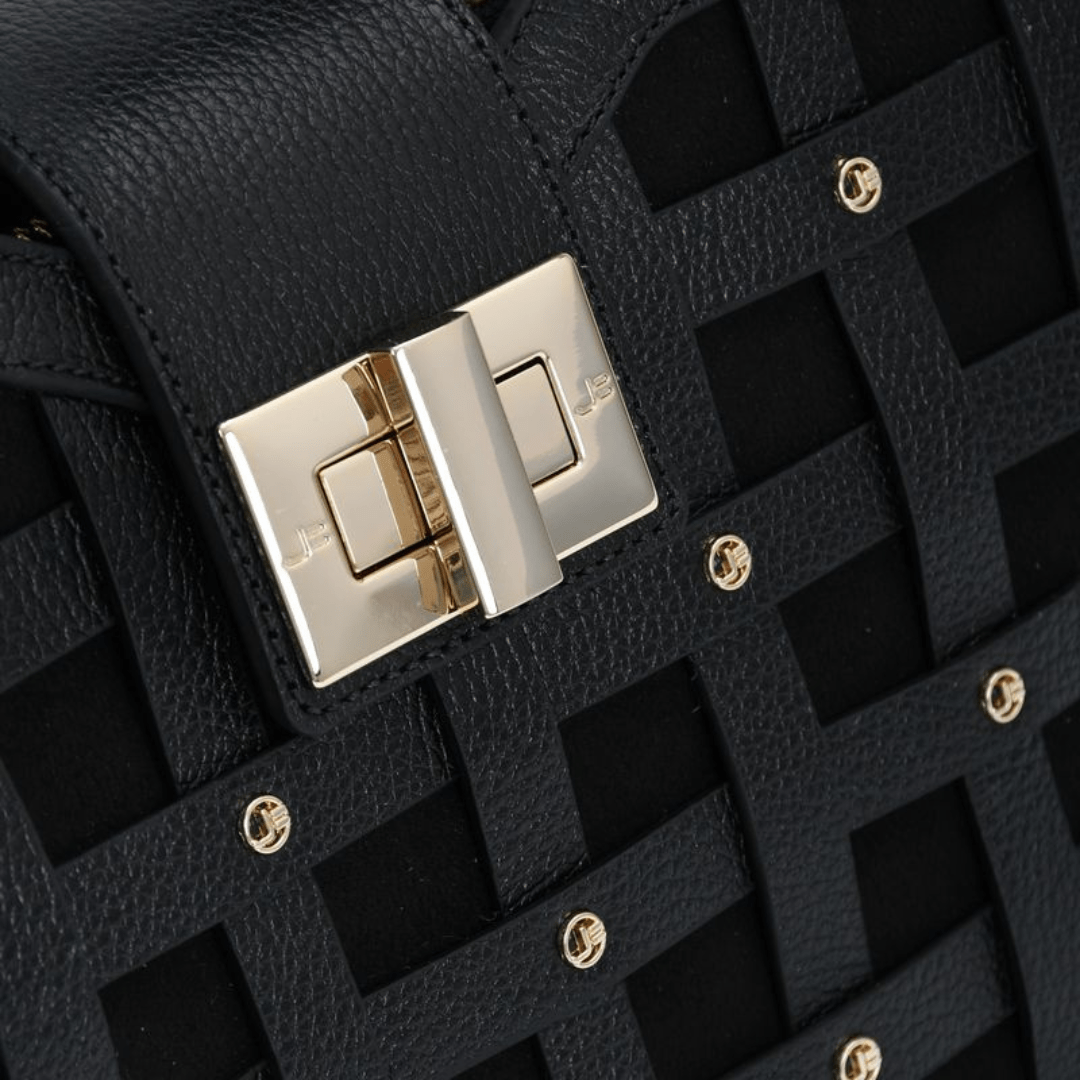 Design autoral e elegante com detalhe frontal em couro recortado e mandalas JB douradas.