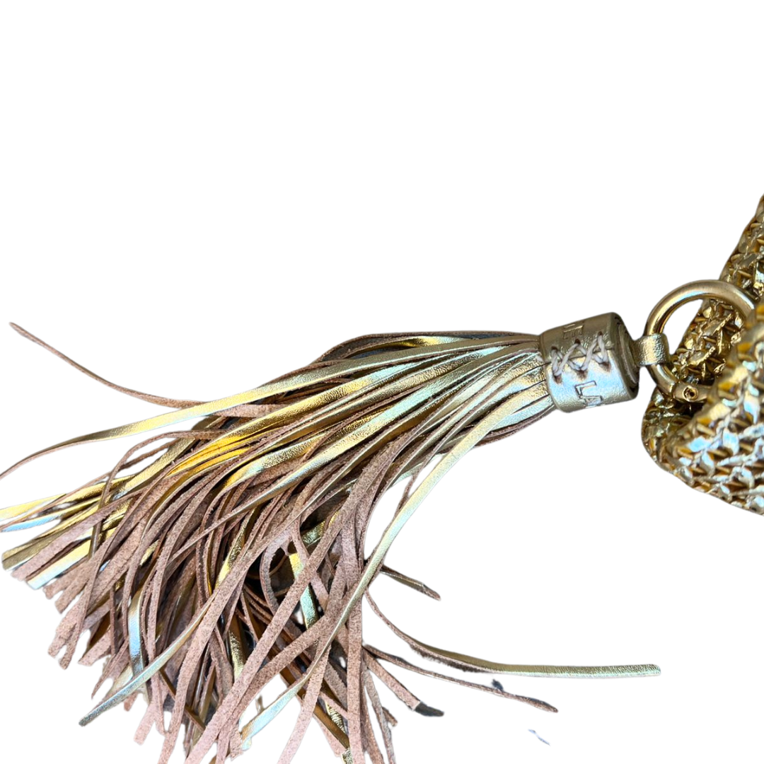 Detalhes: Tassel (pingente) lateral dourado com franjas metalizadas