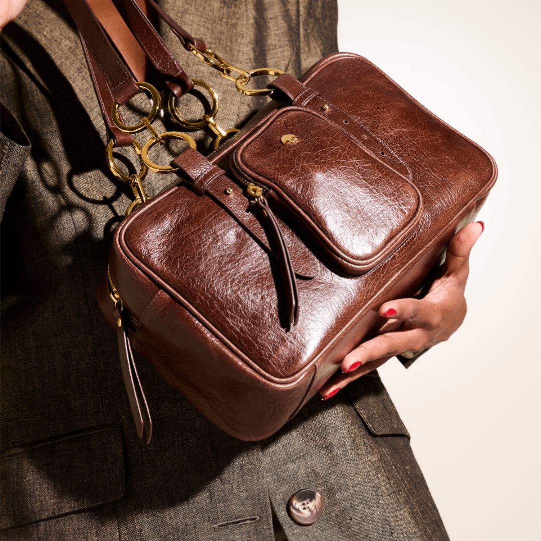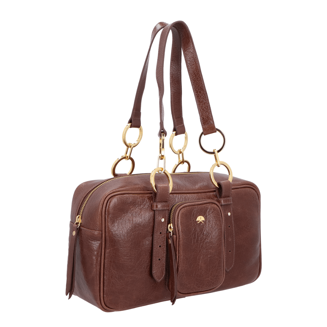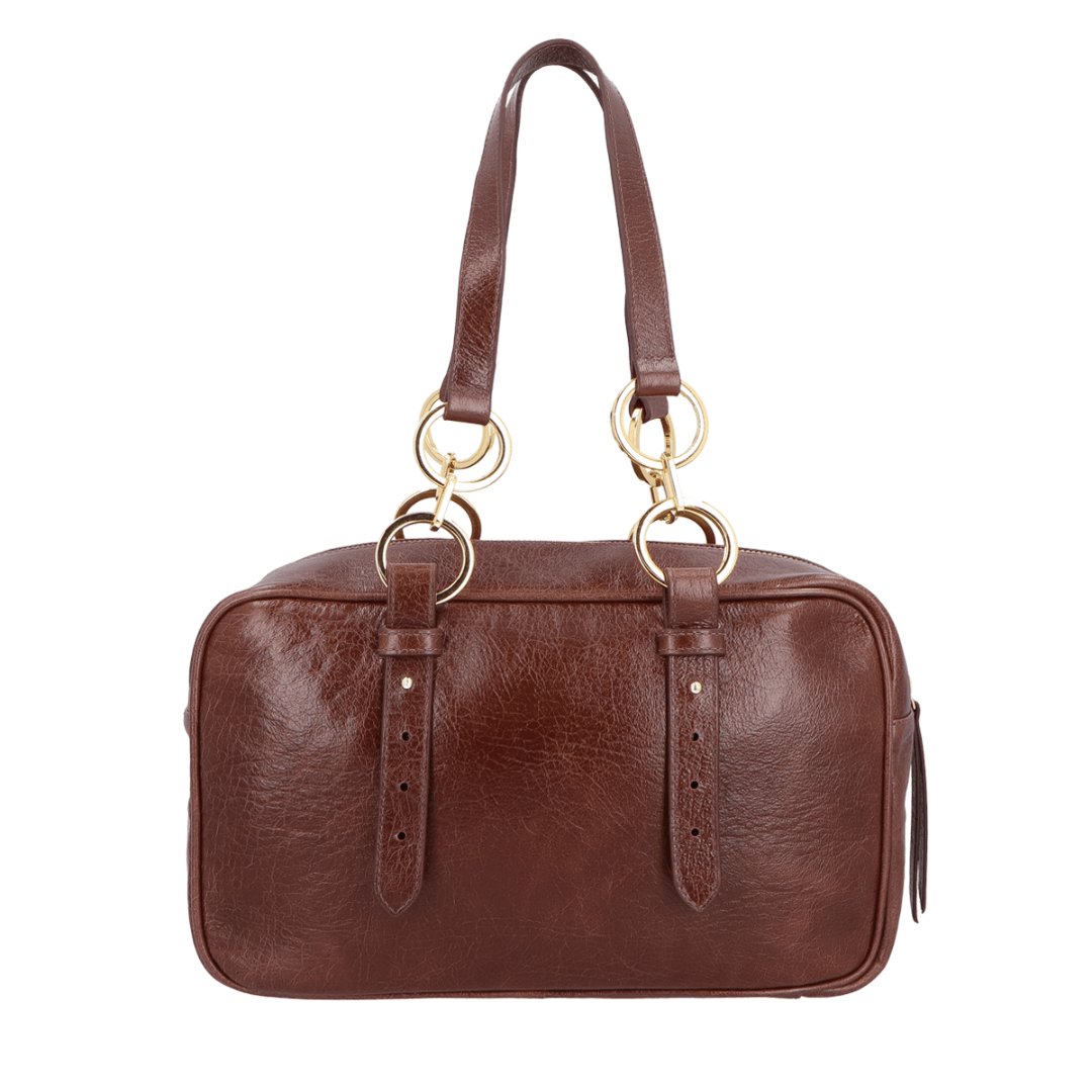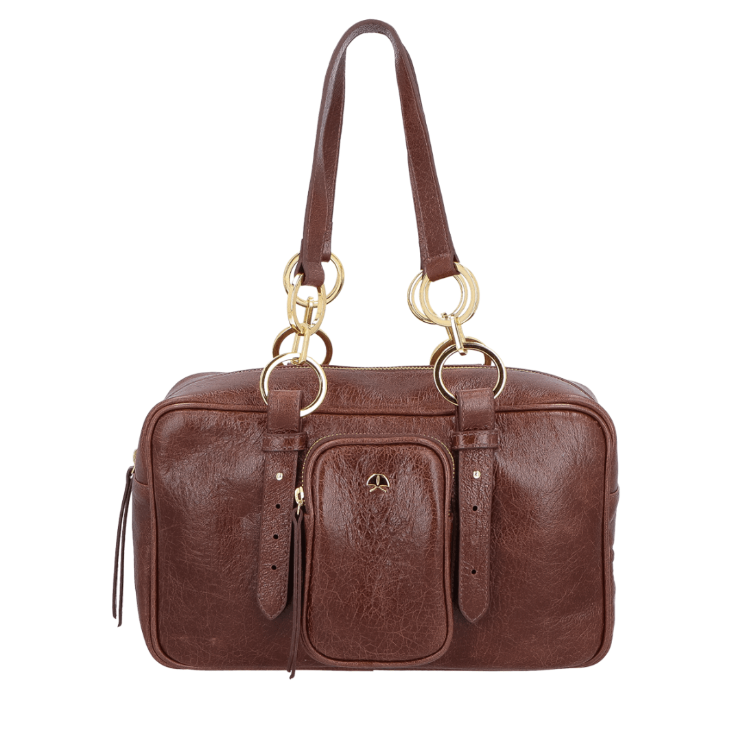 Bolsa Luiza Barcelos Média em Couro Café com Alças de Argolas Douradas – Elegância e praticidade no dia a dia