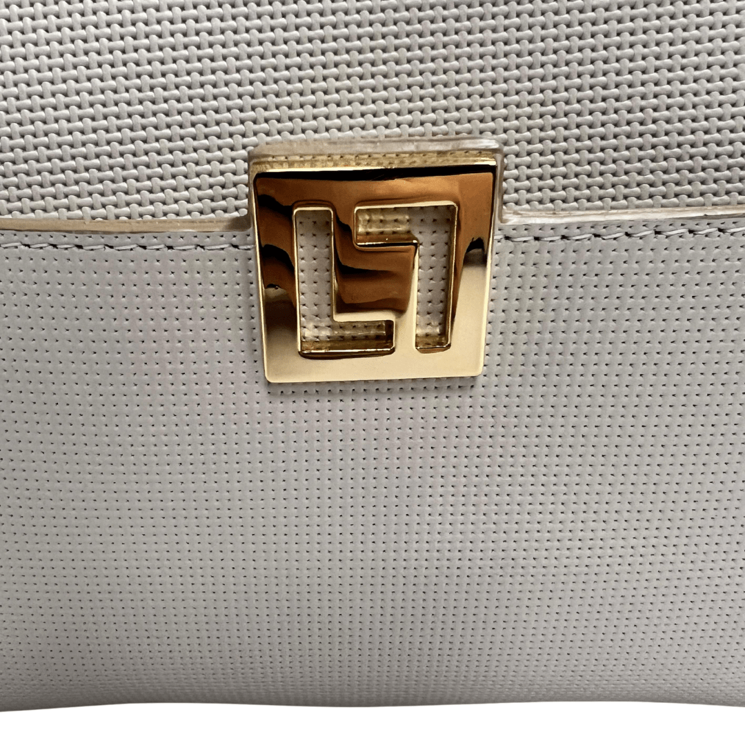 Detalhes metálicos: Logo frontal em dourado e ferragens em tom dourado