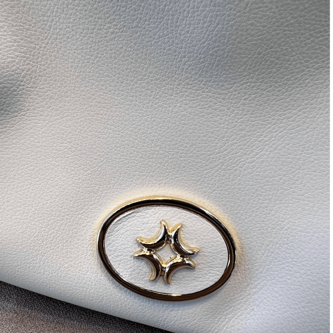 Detalhes: Logo da marca Luz da Lua em metal dourado discreto e sofisticado na lateral e parte frontal.