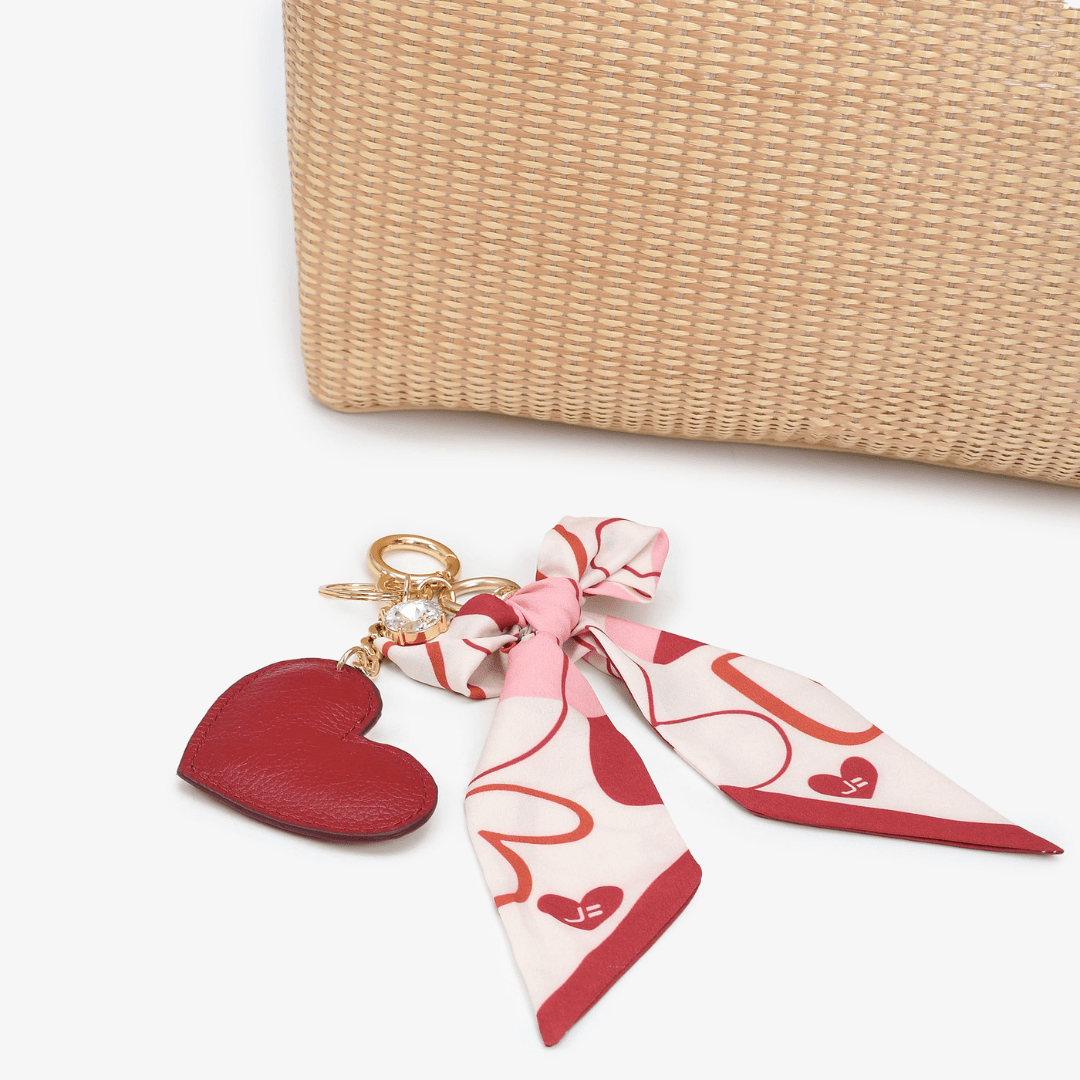 Pingente removível com tecido personalizado JB, mini coração em couro vermelho e detalhe em pedraria.