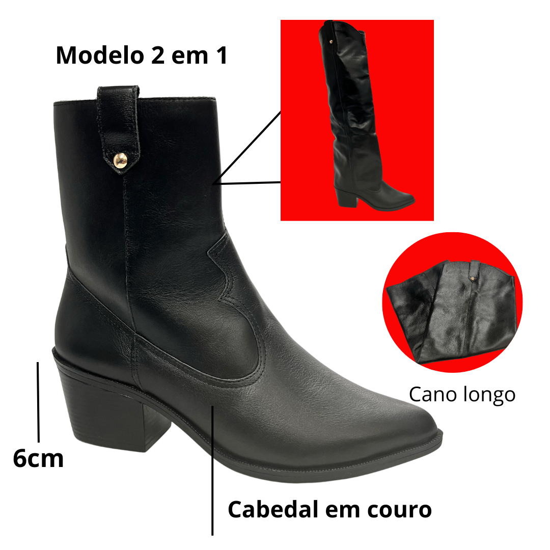 Bota Berti Maria Feminina Preta 2 em 1 Couro