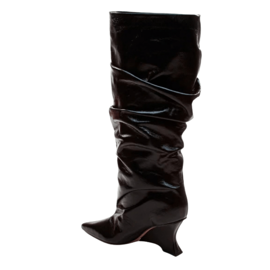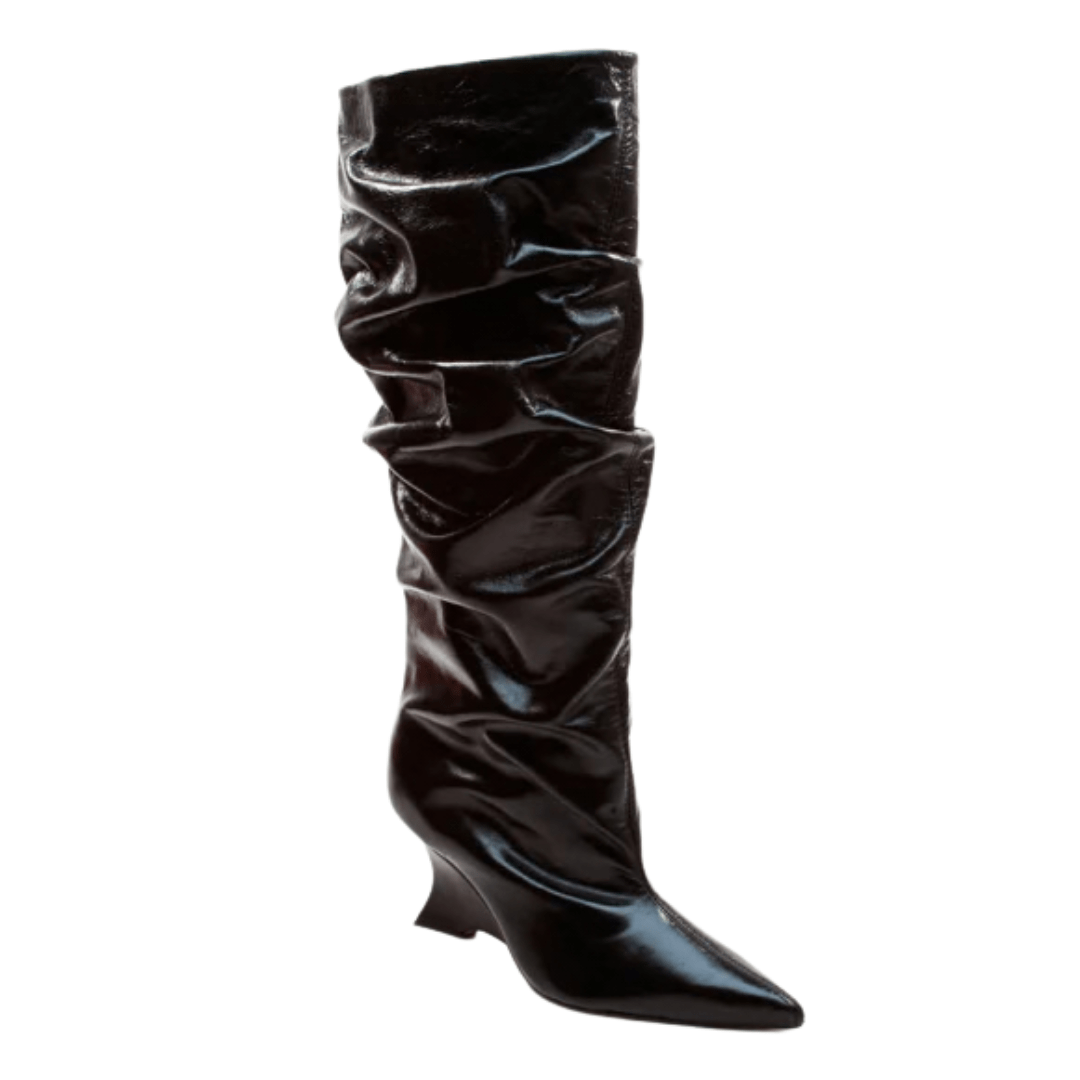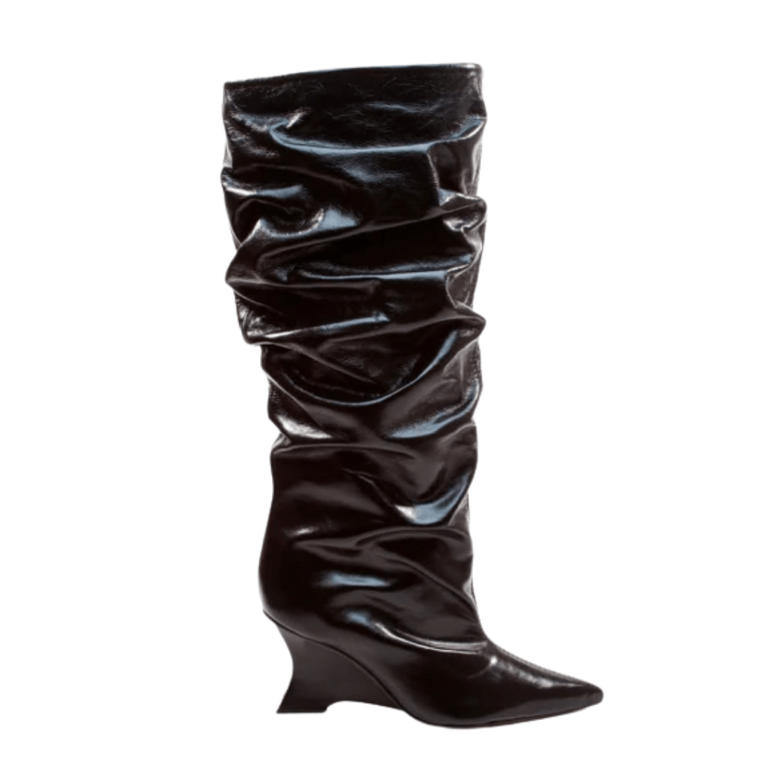 Design Slouchy Moderno: O efeito naturalmente franzido adiciona volume e informação de moda, transformando uma bota preta clássica em um item de alto destaque.