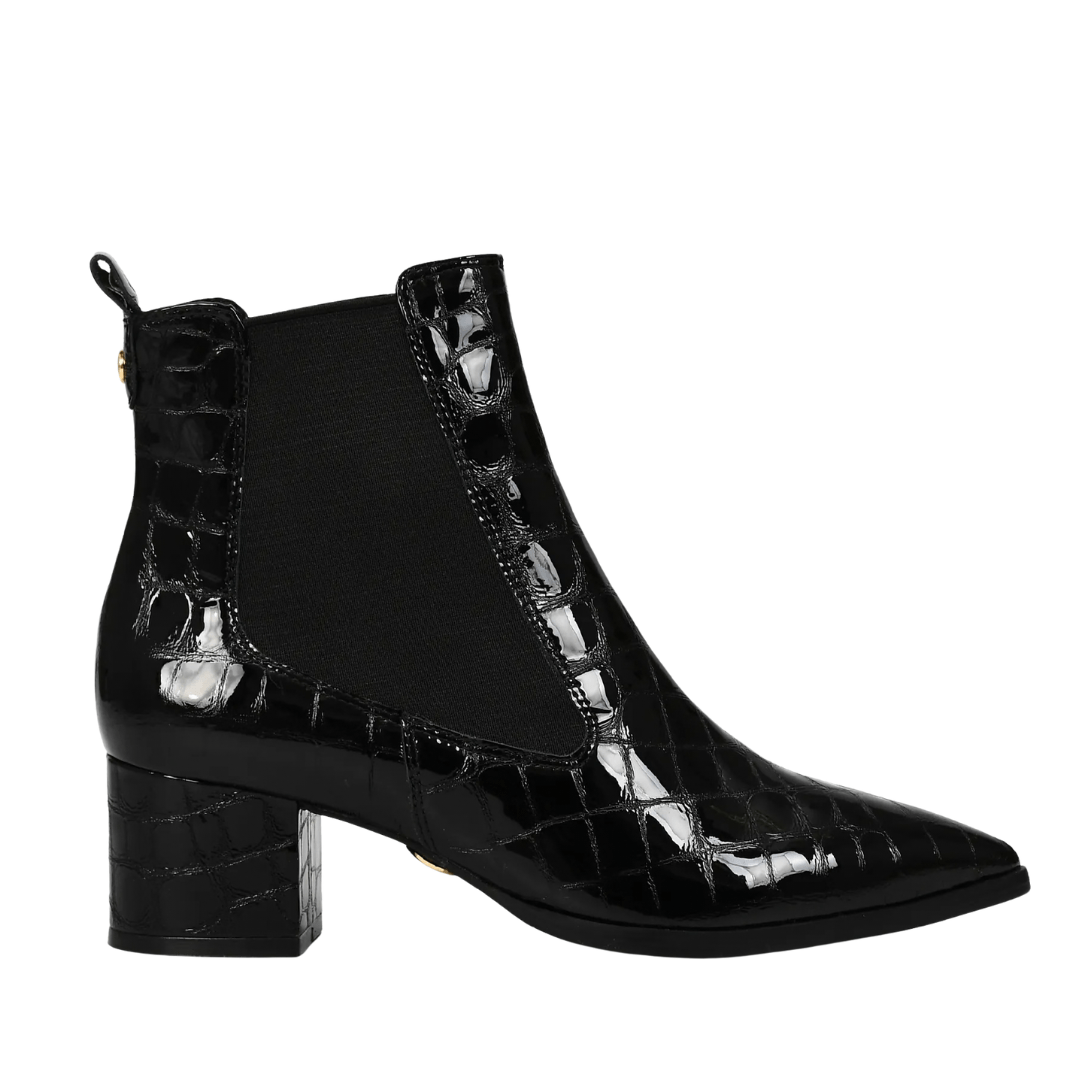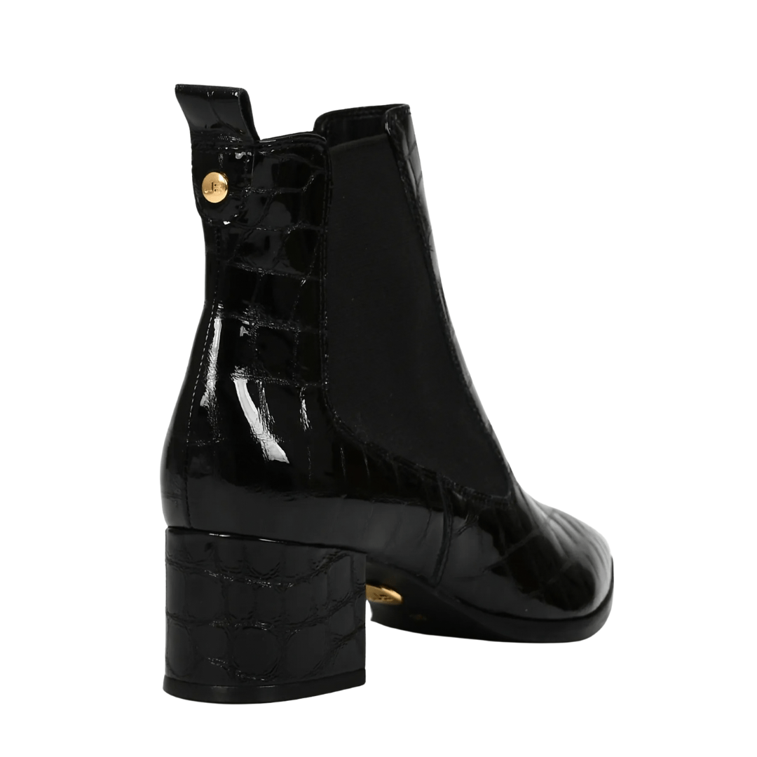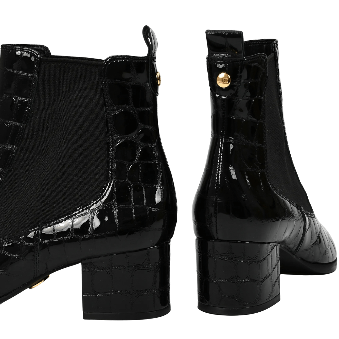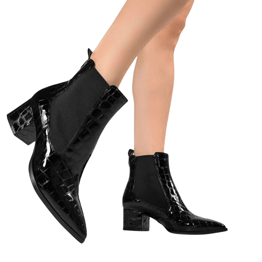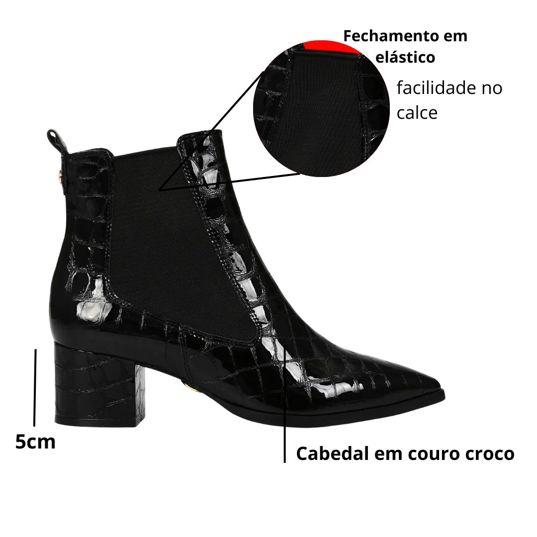 Textura Croco Exclusiva: A padronagem croco adiciona personalidade e uma camada extra de sofisticação, transformando a bota preta básica em um item de moda imponente.