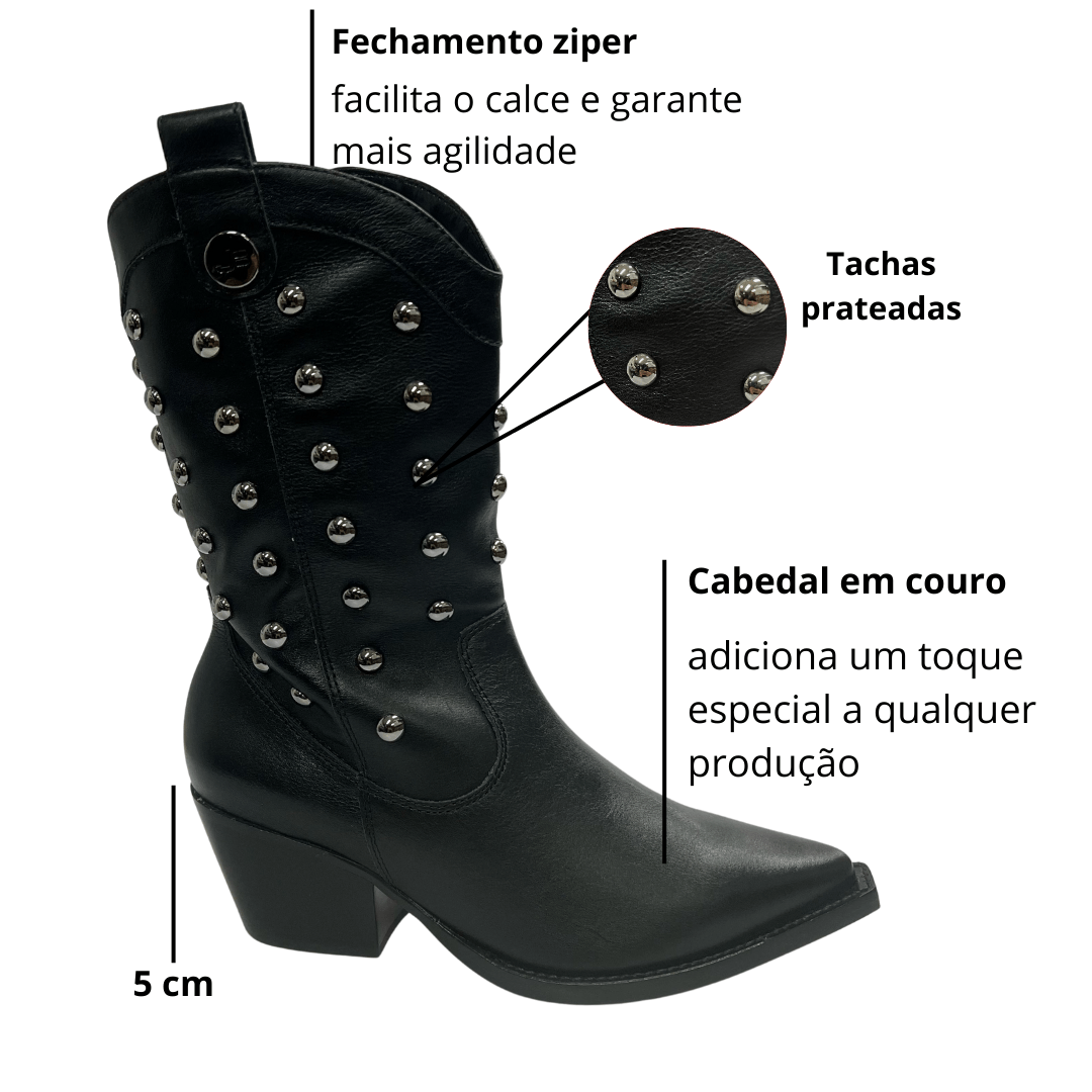 Modelo: Bota Jorge Bischoff Feminina Western Tachas Preto Couro