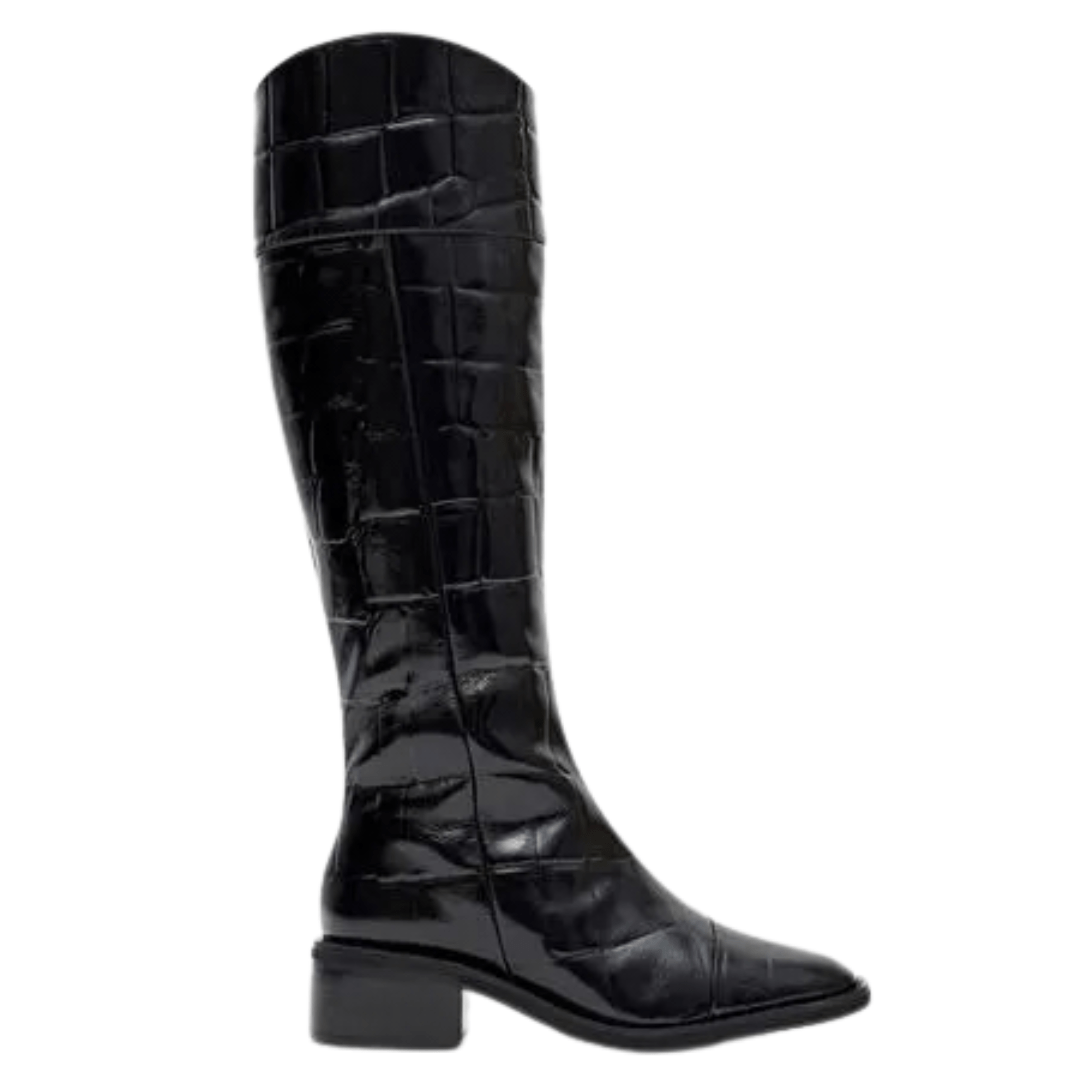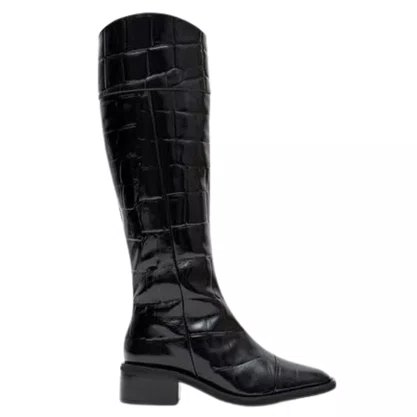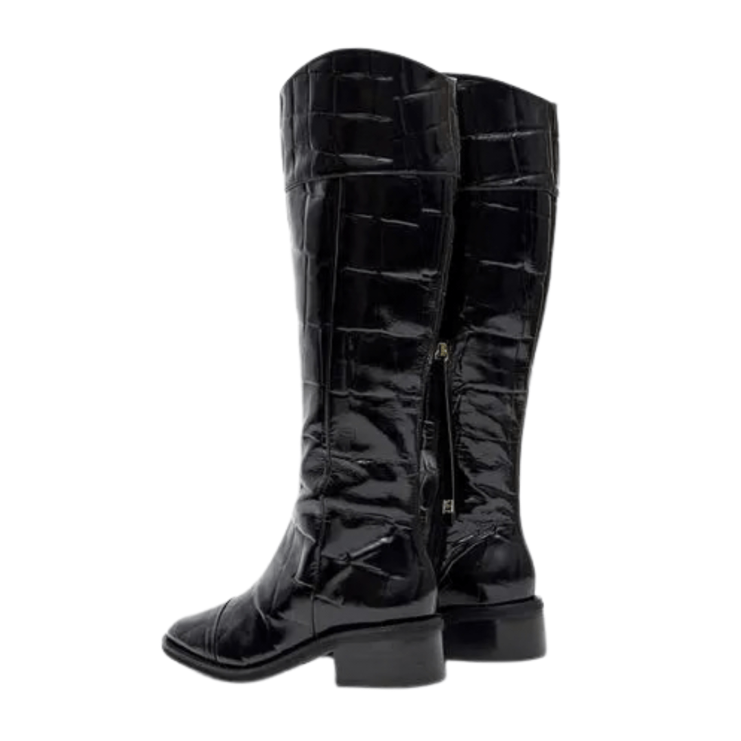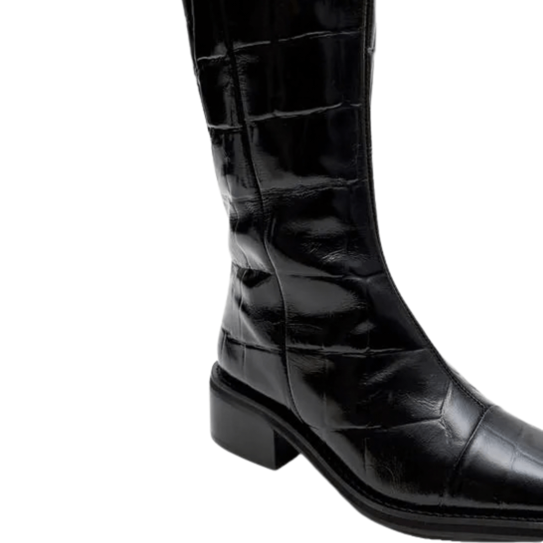 3. Como manter o brilho do acabamento croco? Para preservar o visual luxuoso, recomendamos a limpeza com um pano seco ou levemente umedecido e o armazenamento da bota com enchimento no cano para manter sua forma estruturada original.