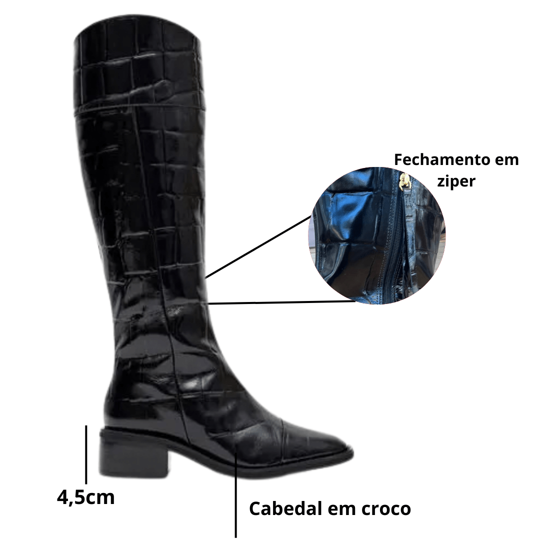 Modelo: Bota Lança Perfume Montaria Feminina Preta Couro Croco