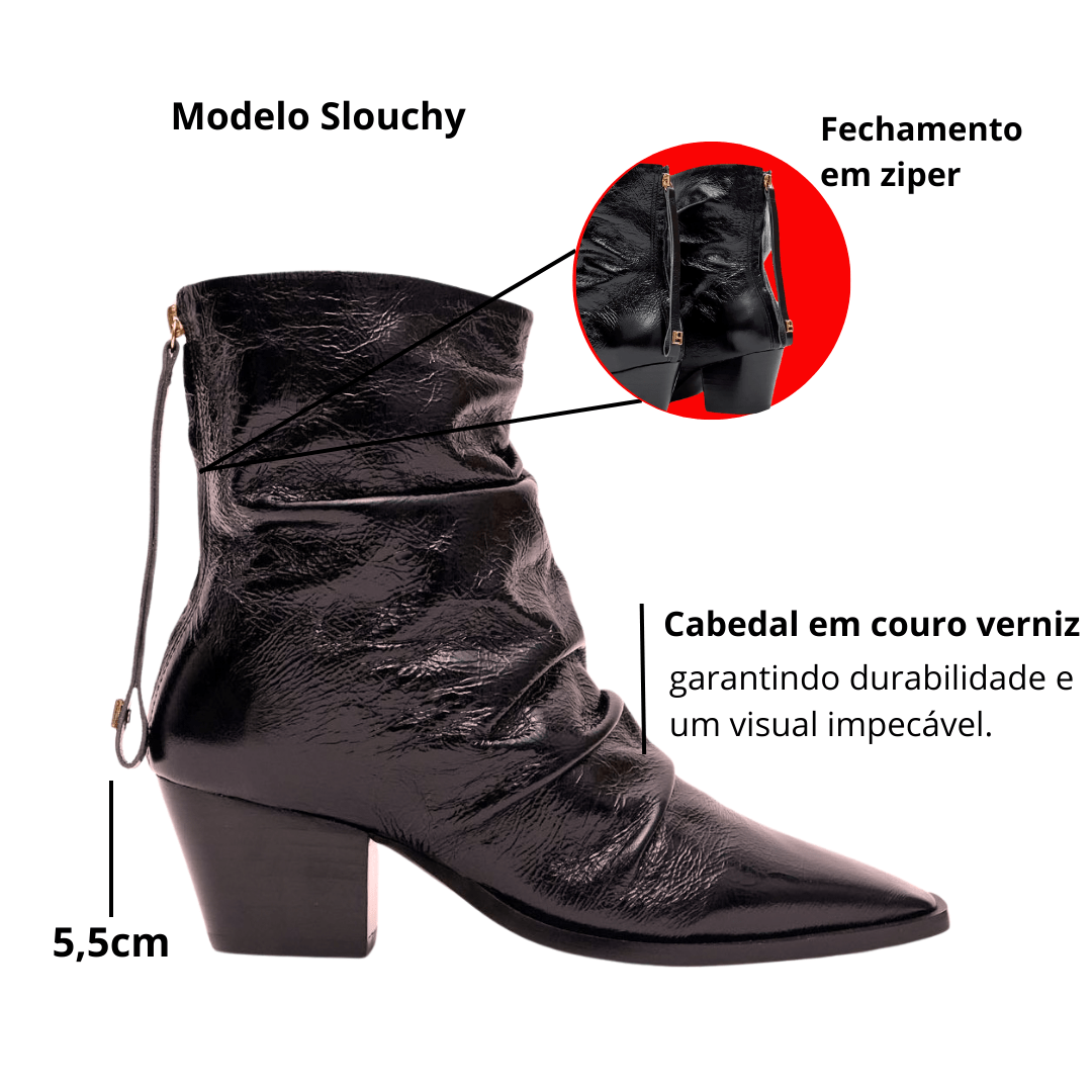 Eleve suas produções com o brilho e a atitude do design slouchy. Adicione a Bota Slouchy Coffee Couro Verniz ao seu carrinho e experimente o luxo de um calçado feito para se destacar.