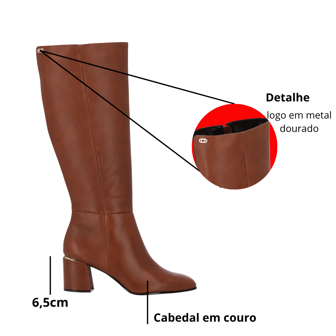 Toque de Luxo Metálico: O detalhe dourado no salto é o selo de sofisticação da marca, transformando uma bota clássica em um item de design exclusivo.