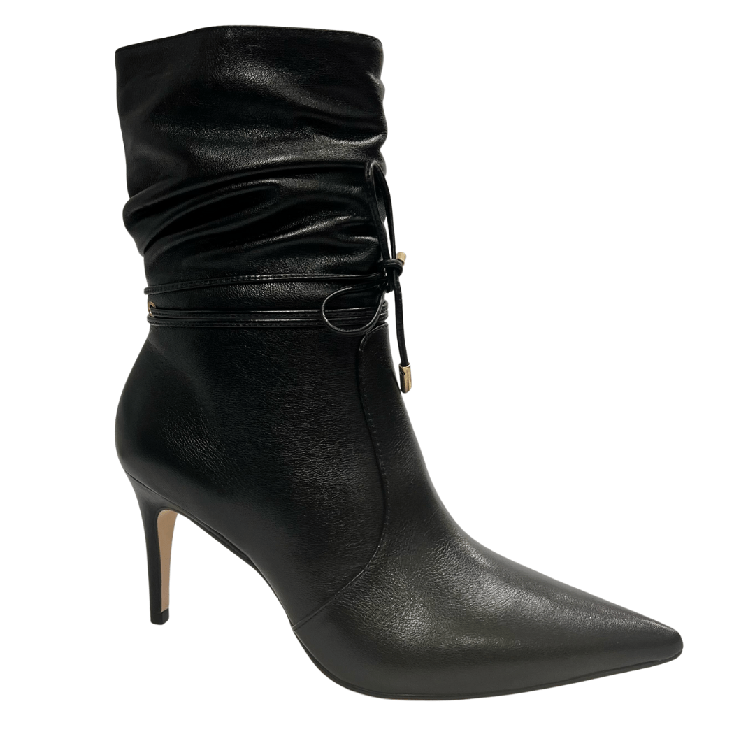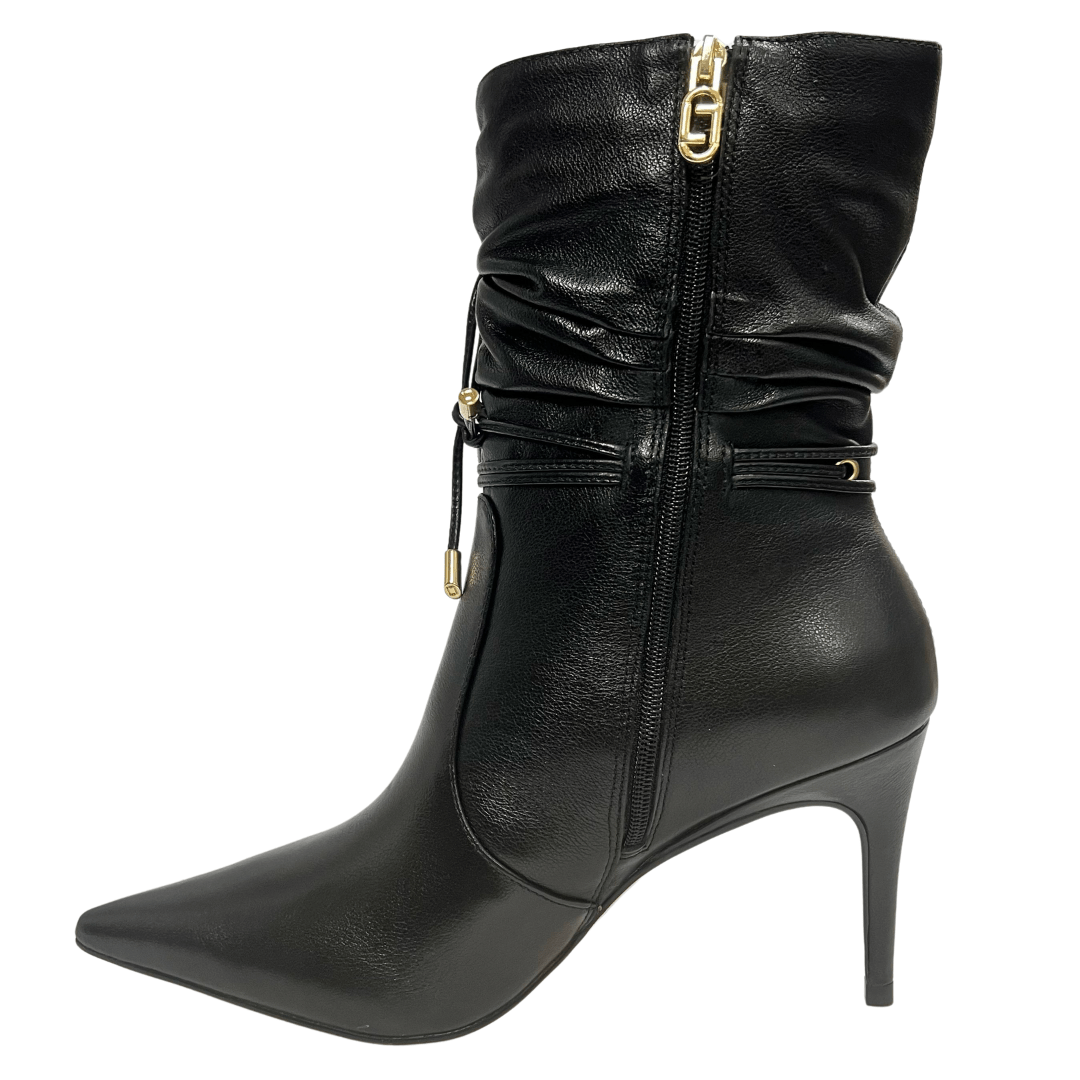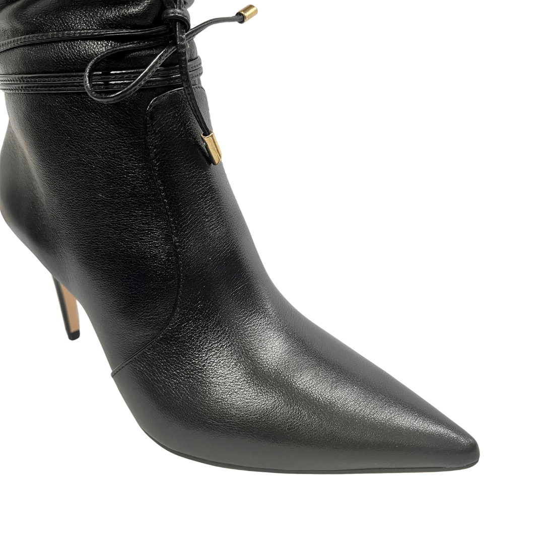 Bota cano curto, em couro na cor Preta. O modelo tem bico fino, salto fino e fechamento com zíper na parte interna. Detalhe para a parte superior do cano que é maleável. Possui ajuste em atacador na altura do tornozelo. Detalhe para metal dourado nas ponteiras. Salto tamanho 8,5cm