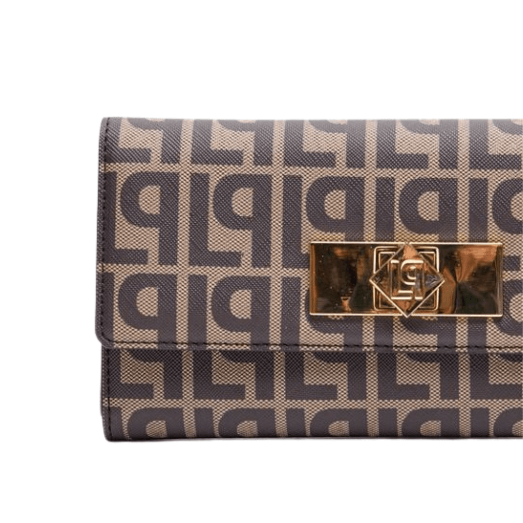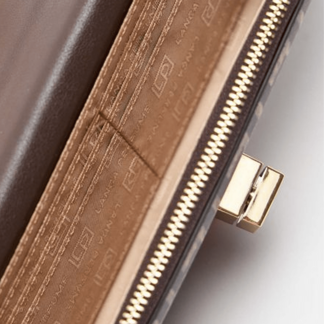 Design exclusivo: estampa monograma icônica da marca e fecho metalizado com logo LP, que traduzem estilo e personalidade.