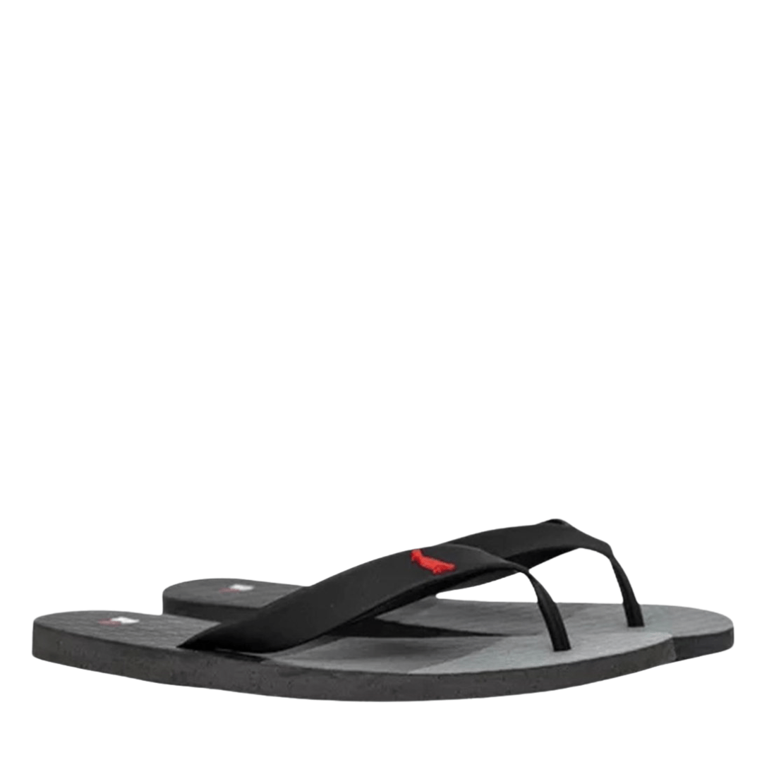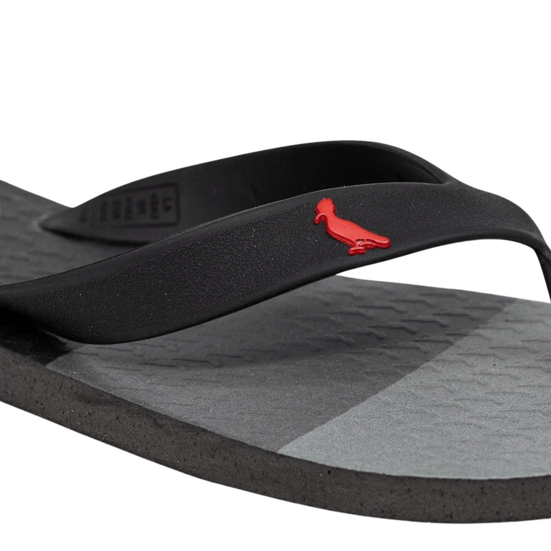 Tiras resistentes em preto com o clássico logo da Reserva em vermelho, marcando presença com sutileza.