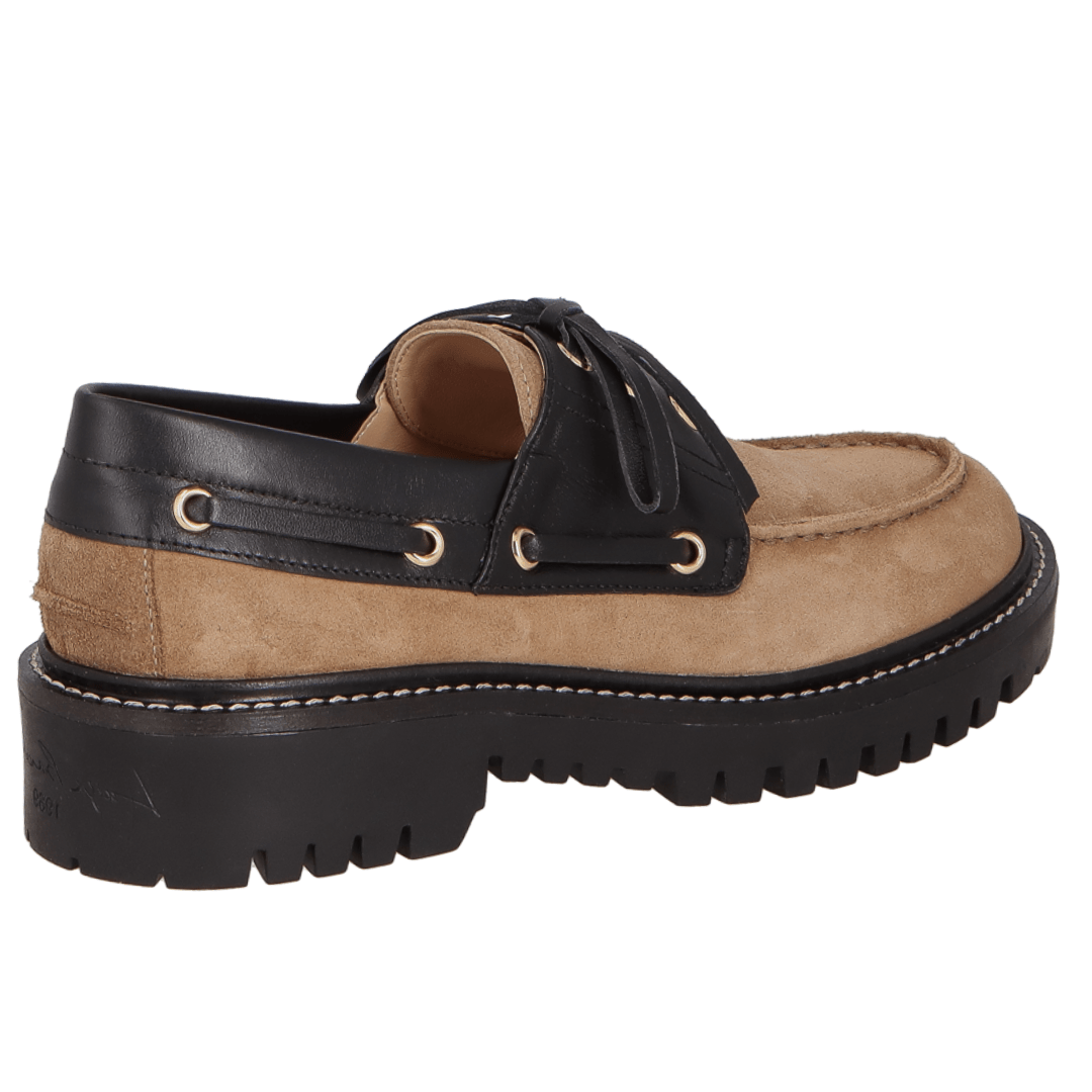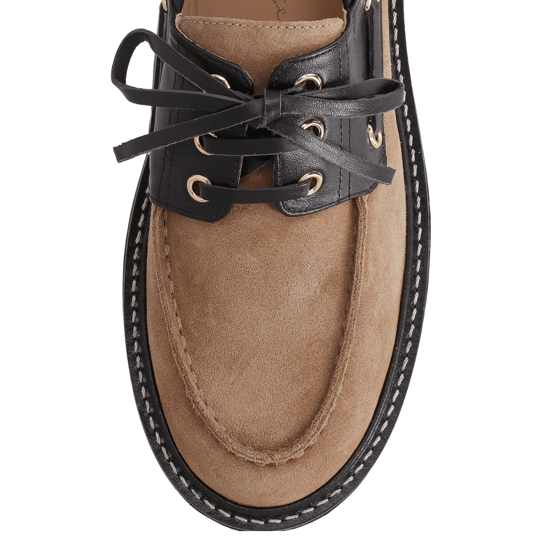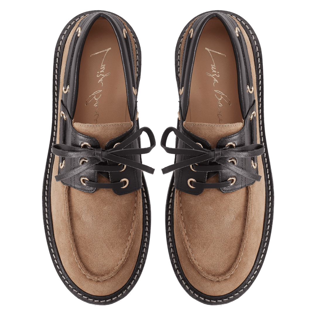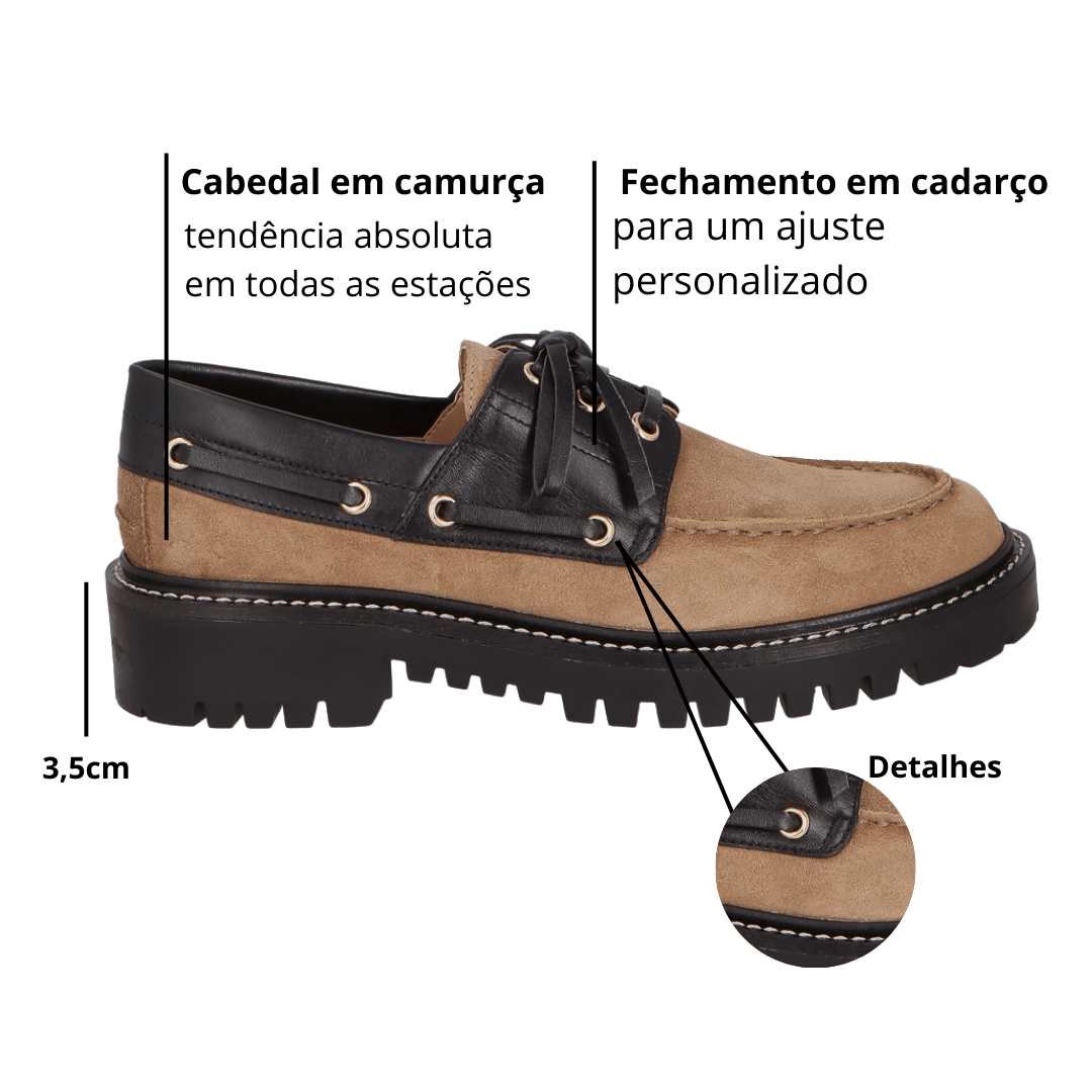 Para a mulher que deseja marcar presença com um visual autêntico e cheio de atitude, o Mocassim Luiza Barcelos é a peça indispensável. Esta versão exclusiva une a sofisticação da camurça no tom Fendi (bege acinzentado) com o contraste moderno do couro preto e do solado tratorado. Inspirado na estética náutica, mas com uma roupagem totalmente urbana, ele é o calçado que transforma qualquer look básico em uma produção de editorial de moda.