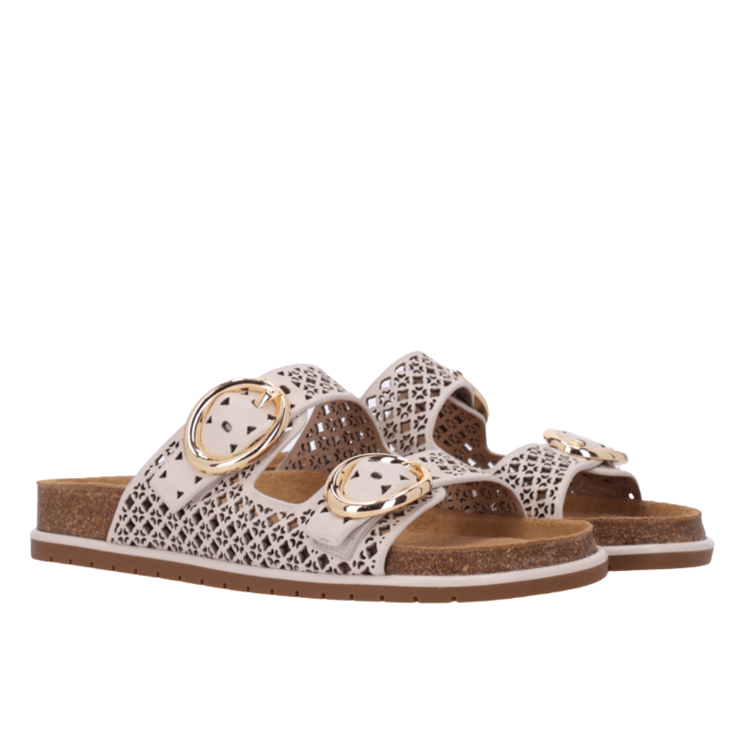 Fechamento: duas tiras ajustáveis com fivelas metálicas douradas