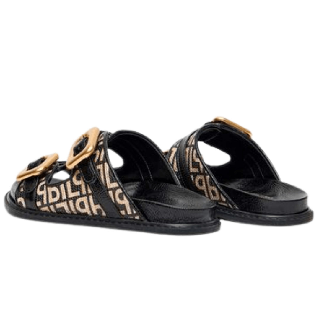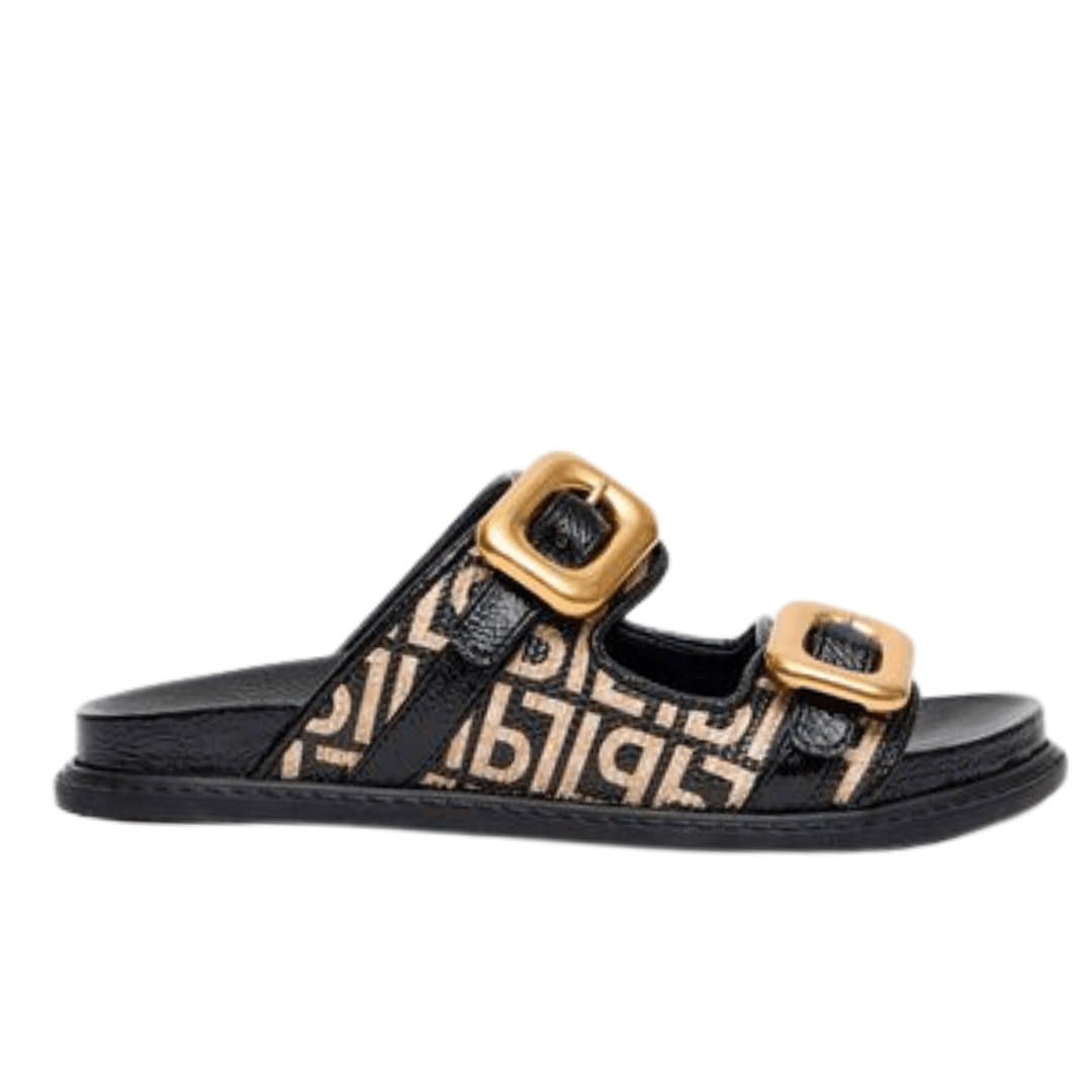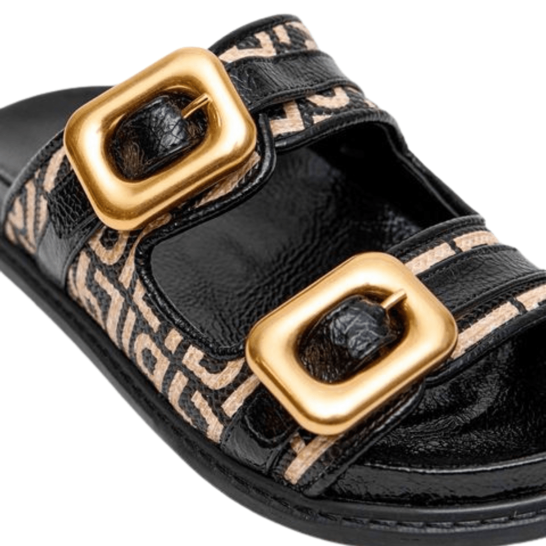 Tiras estruturadas com fivelas metálicas robustas, conferindo um toque moderno e sofisticado.