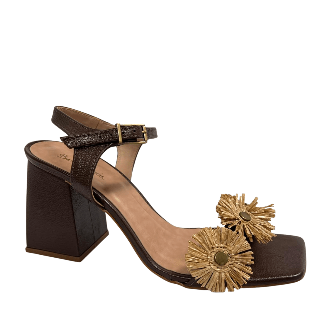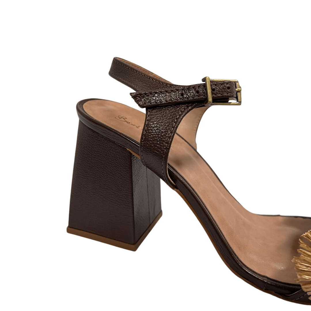 Sandália Berti Maria Feminina Salto Bloco Ráfia Marrom Couro