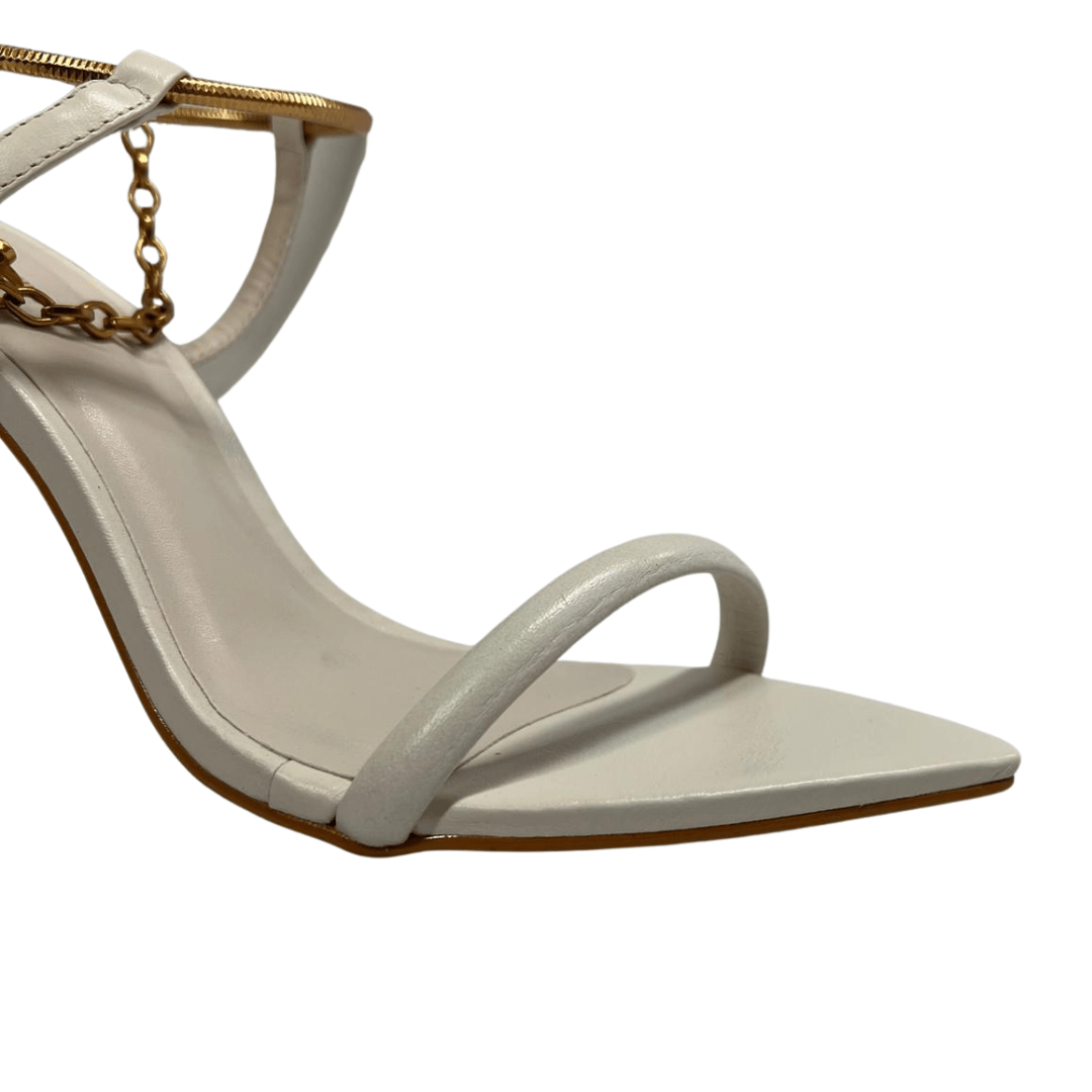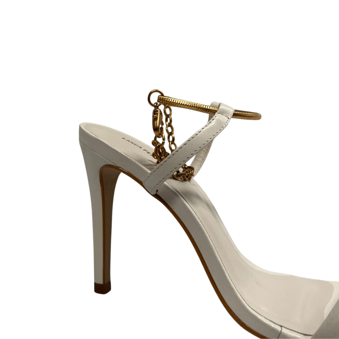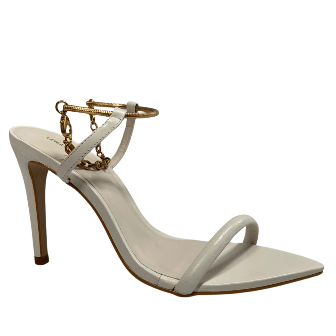 Destaque-se com o charme e a elegância da Sandália Lança Perfume Bico Folha Branco Couro.