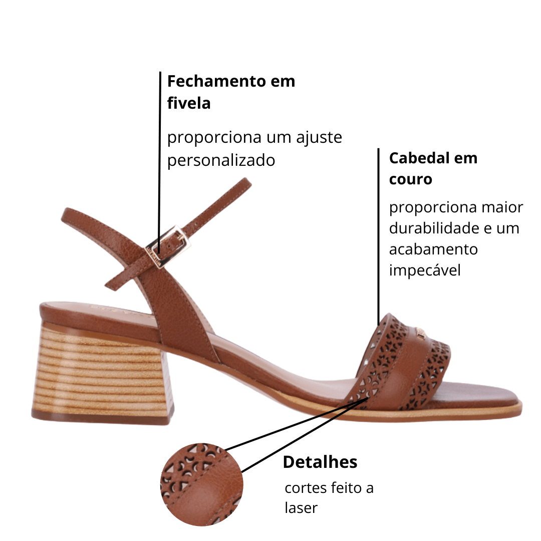 Conforto garantido: palmilha macia e salto bloco de 5 cm que oferecem equilíbrio e praticidade.