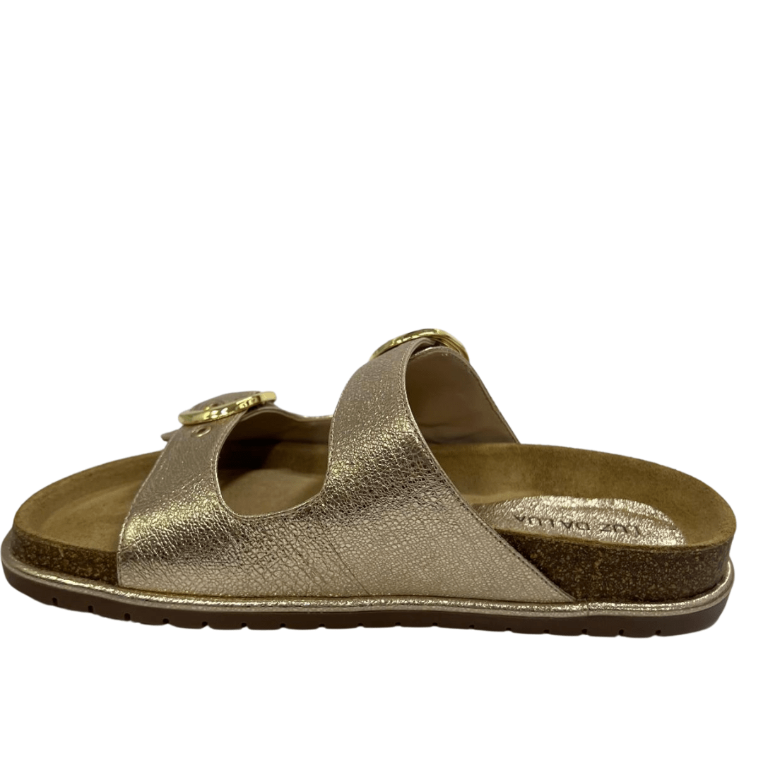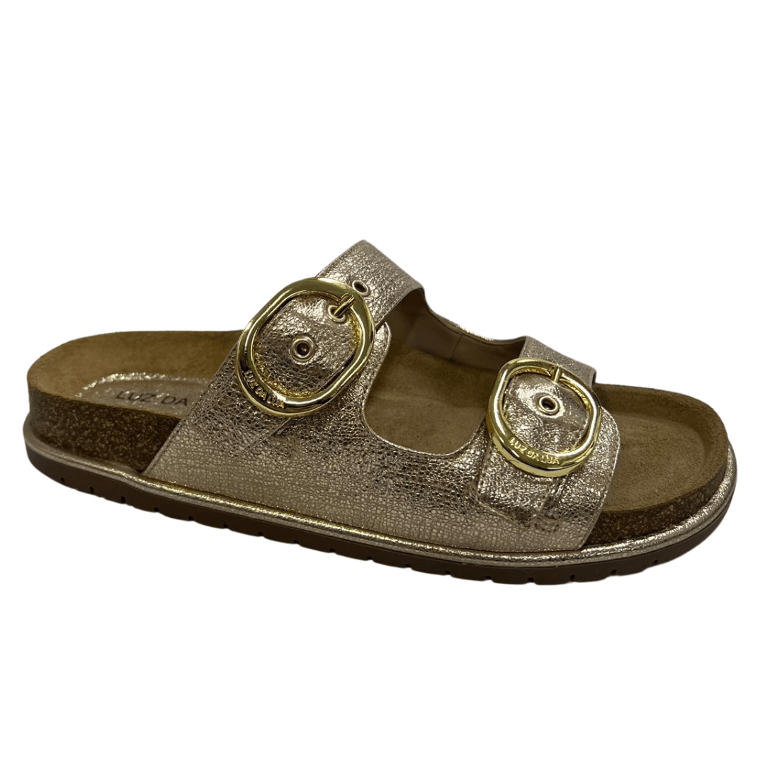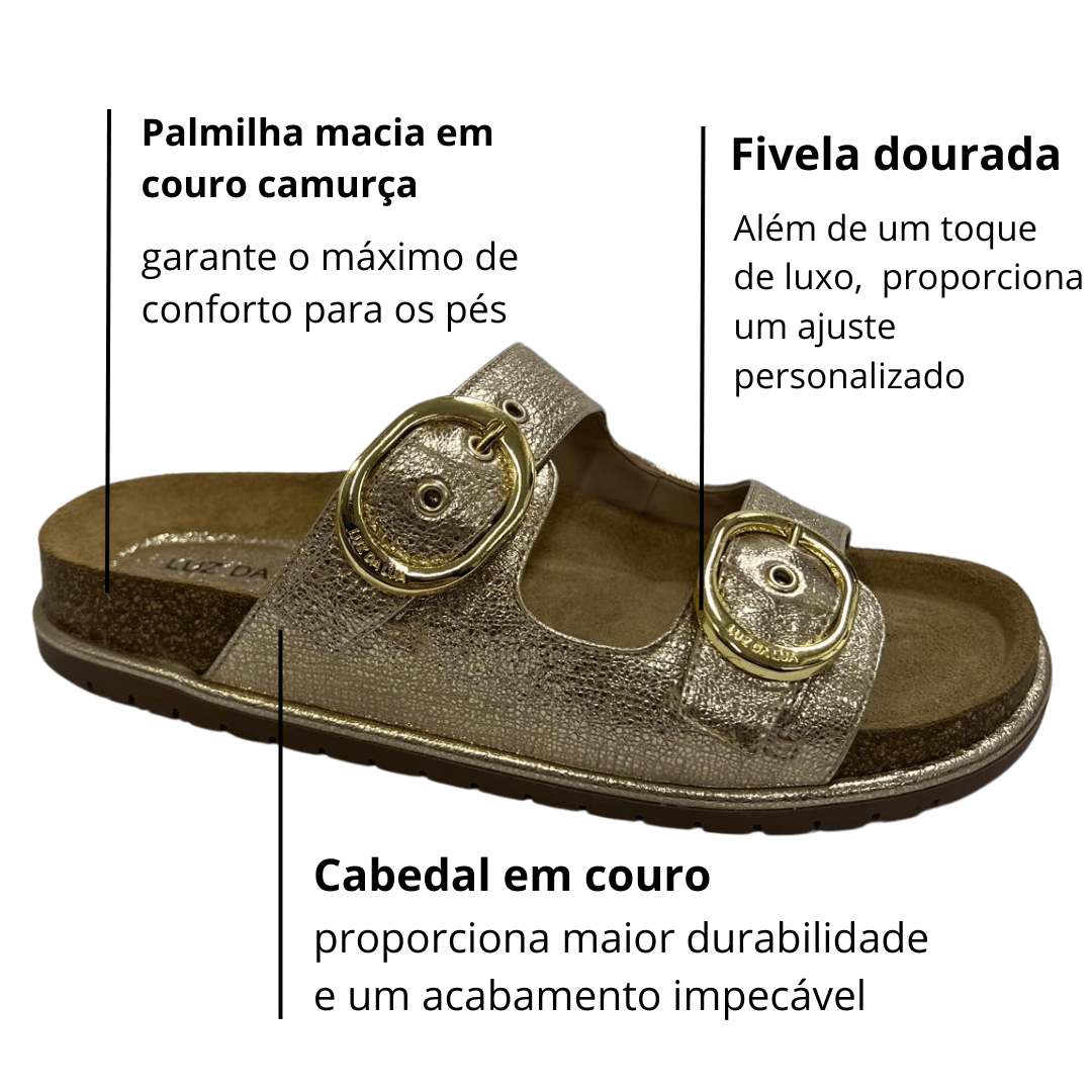 O cabedal em couro dourado metalizado traz elegância e durabilidade, enquanto a palmilha macia em couro camurça garante o máximo de conforto para os pés. As duas fivelas douradas com regulagem permitem um ajuste personalizado, proporcionando segurança e praticidade no calce.