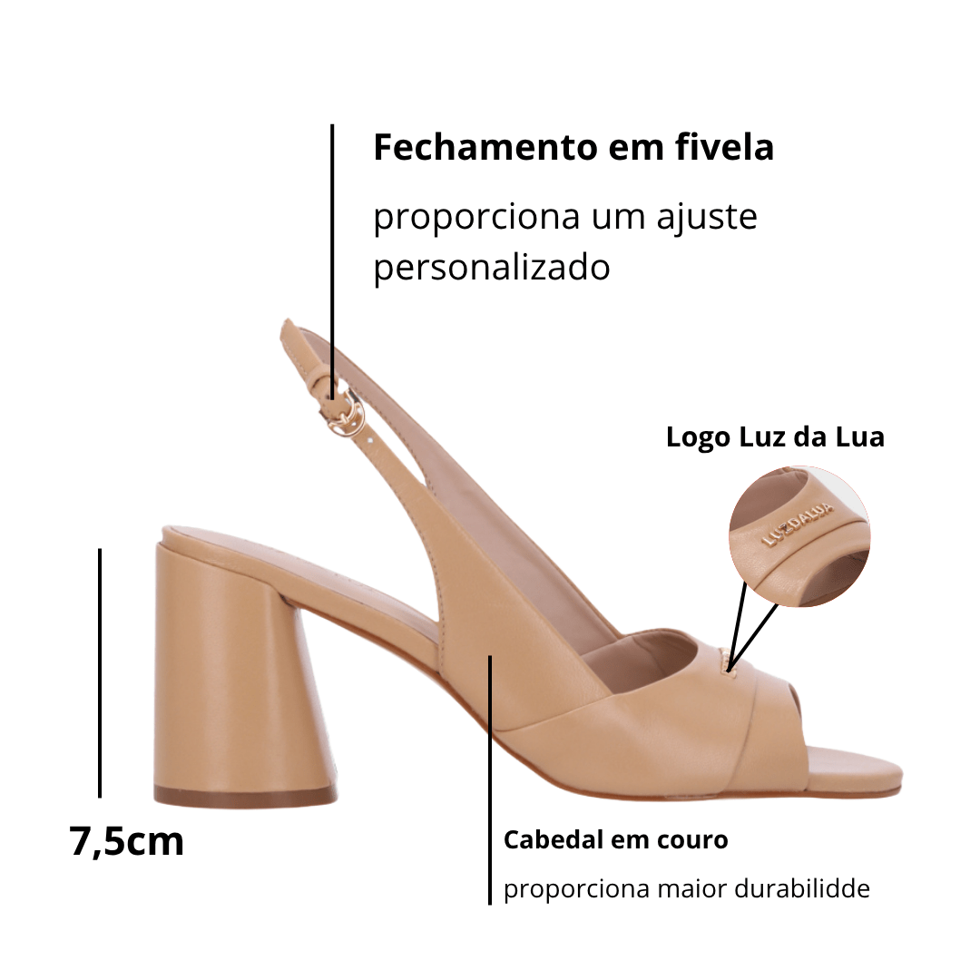 Com um visual leve e sofisticado, esta sandália da Luz da Lua é a escolha ideal para quem busca se destacar com classe. O tom nude alonga a silhueta e combina com tudo, enquanto o salto bloco de 7,5 cm garante conforto e estabilidade ao longo do dia. Uma peça curinga para compor produções elegantes com praticidade.