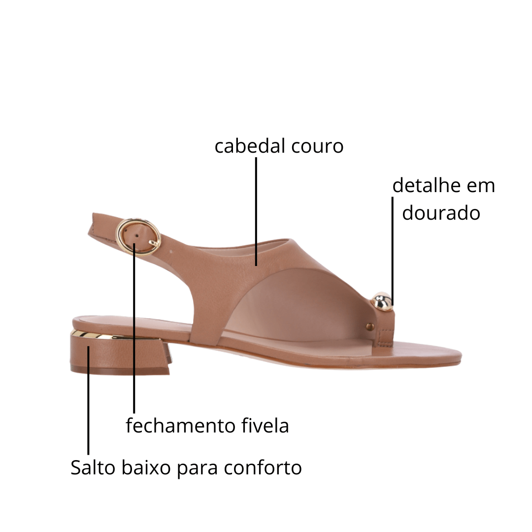 Detalhes: Aplicação de esfera metálica dourada no cabedal, que valoriza o visual sem pesar