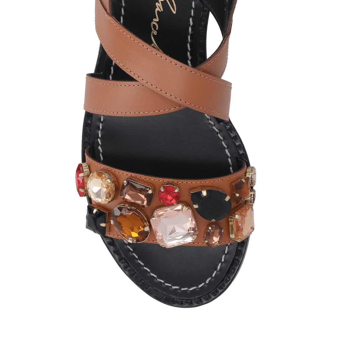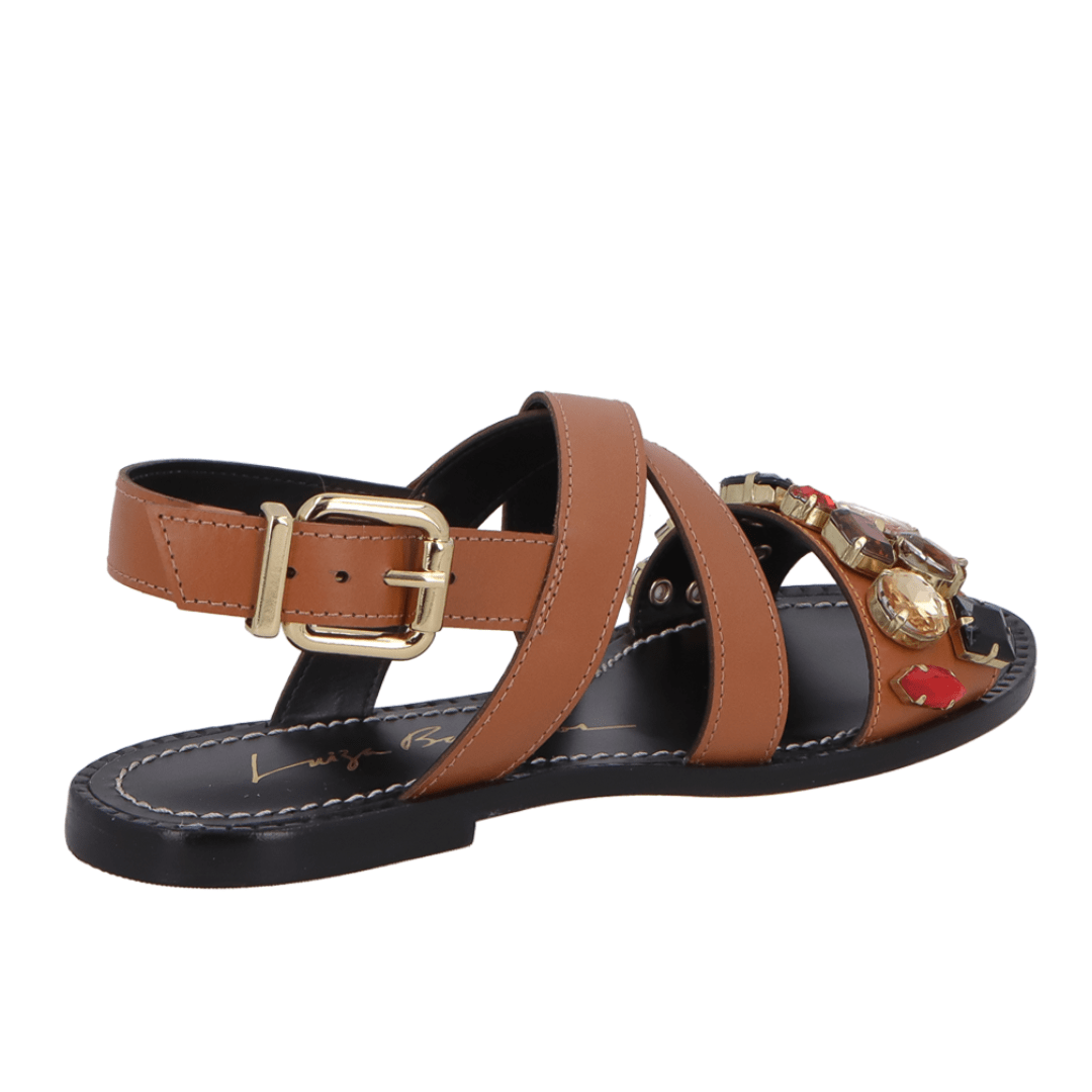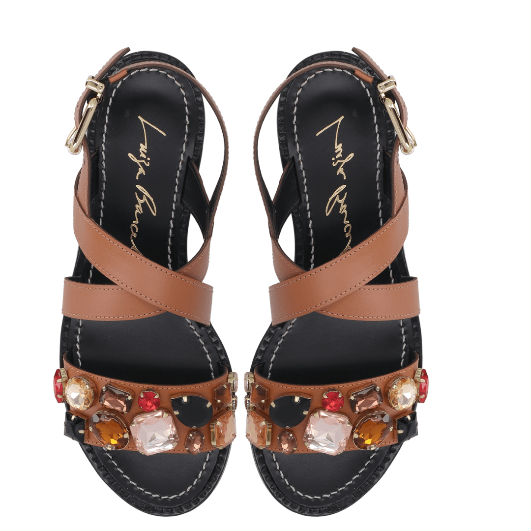 Sandália Rasteira Luiza Barcelos Pedras Multicor Caramelo Couro