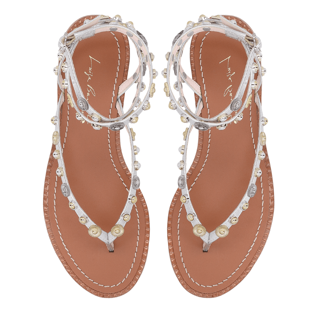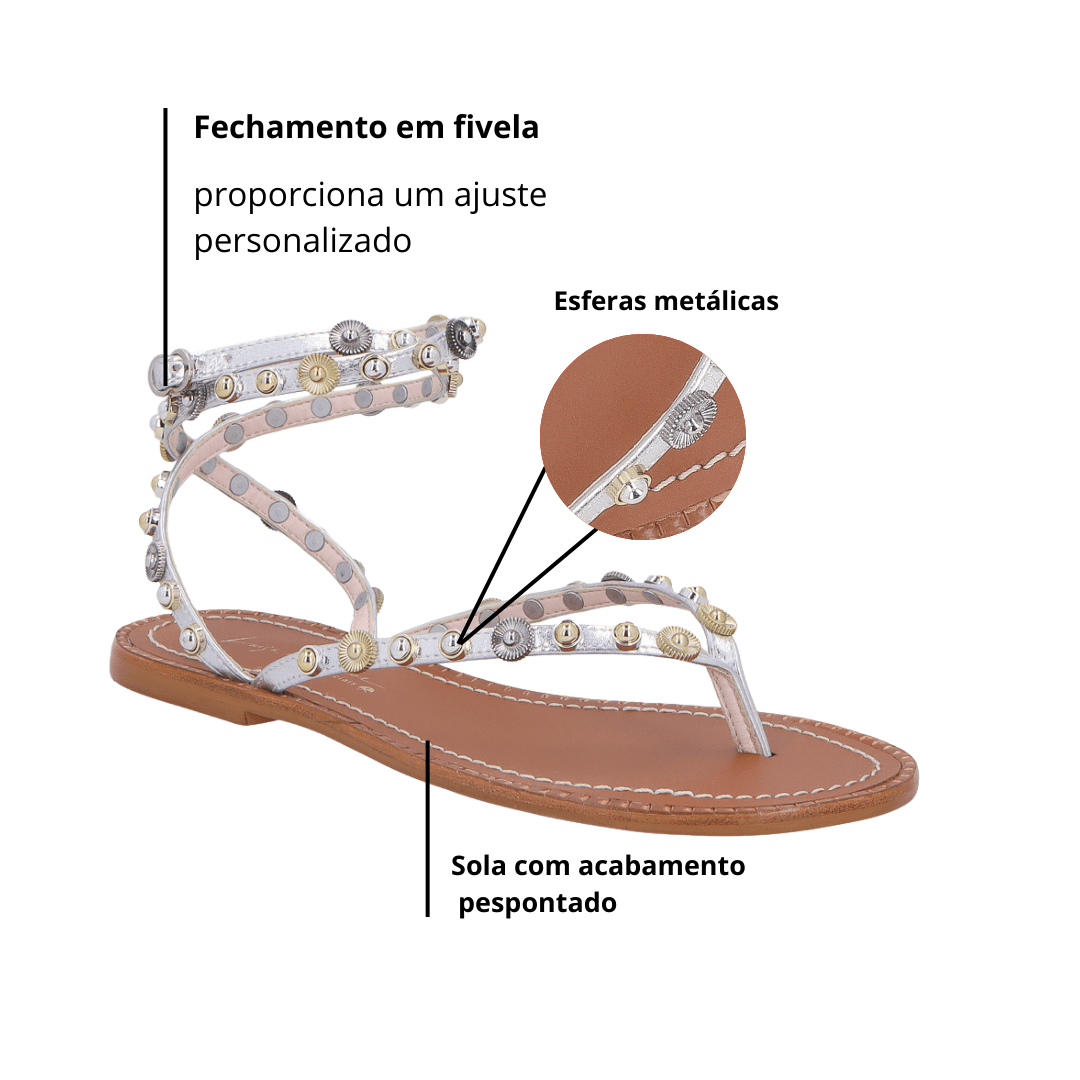 Design boho-chic: Tiras finas com aplicação de esferas metálicas que sobem até o tornozelo, valorizando a silhueta dos pés.