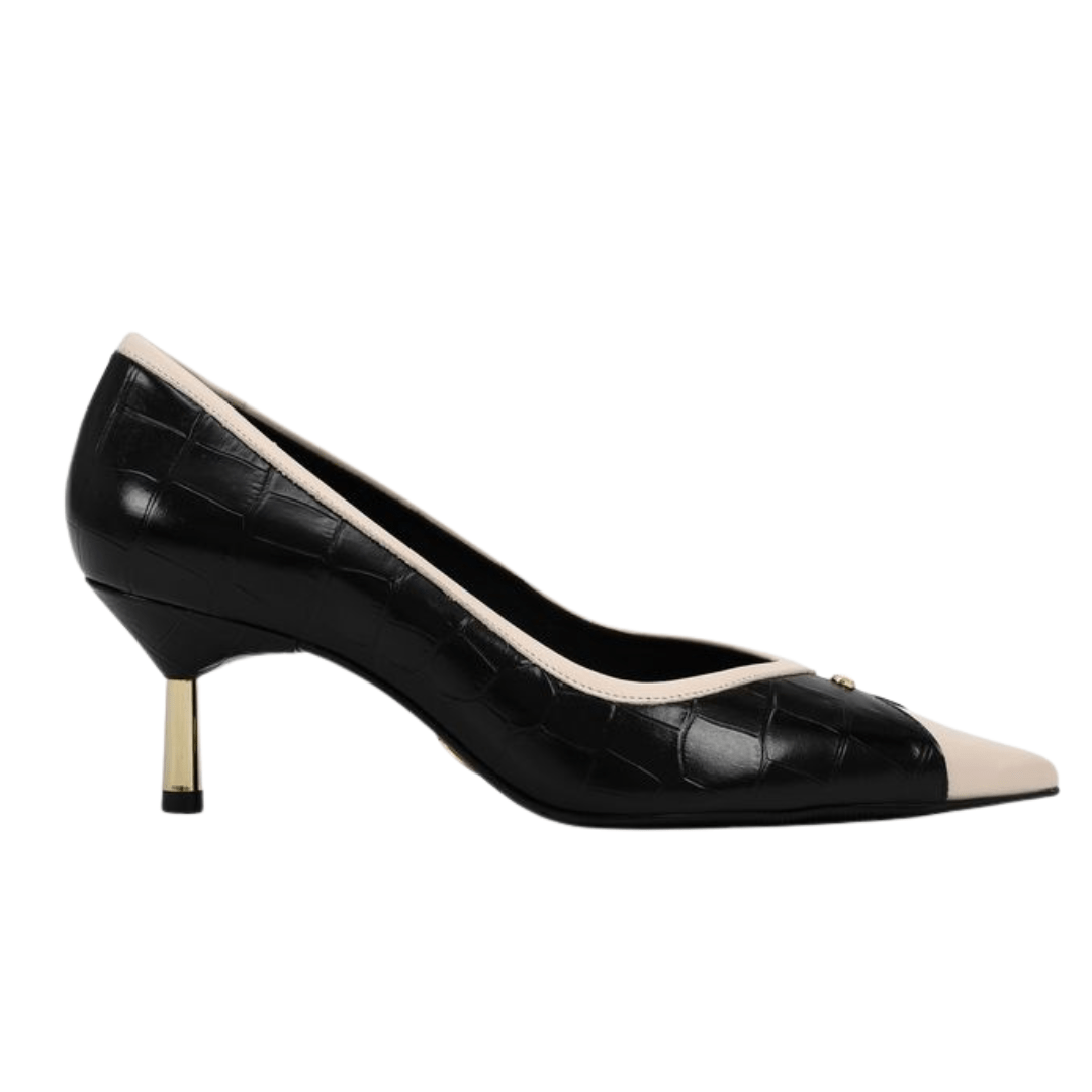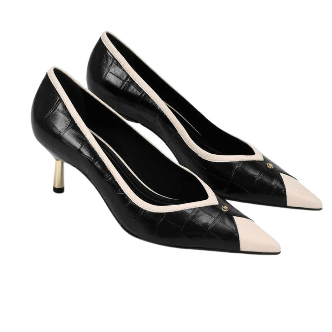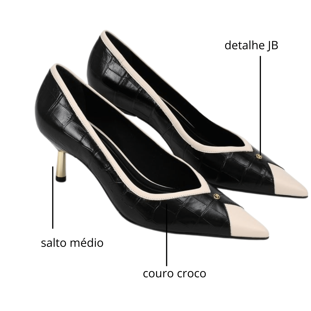 Modelo: Scarpin Jorge Bischoff Feminino Bico Fino Preto Branco Couro Crocco