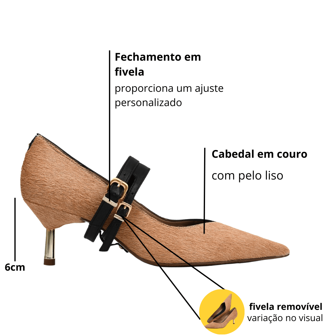 Versátil e elegante, o scarpin pode ser usado com looks de trabalho, alfaiataria, vestidos, saias ou produções mais sofisticadas. A fivela removível permite adaptar o calçado a diferentes estilos, do clássico ao moderno.