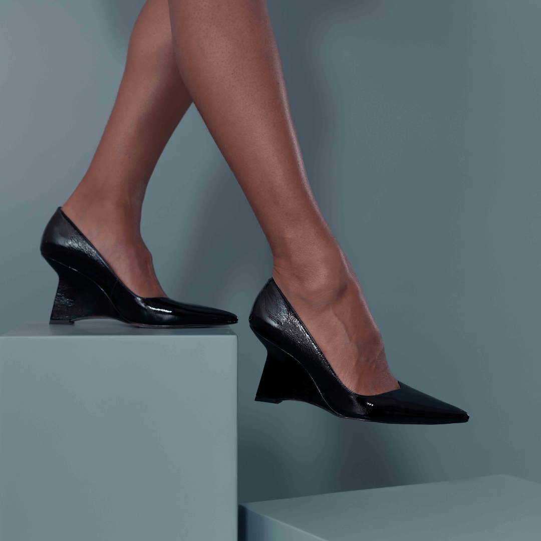 Salto: Anabela alto com design arquitetônico — moderno e confortável ao mesmo tempo