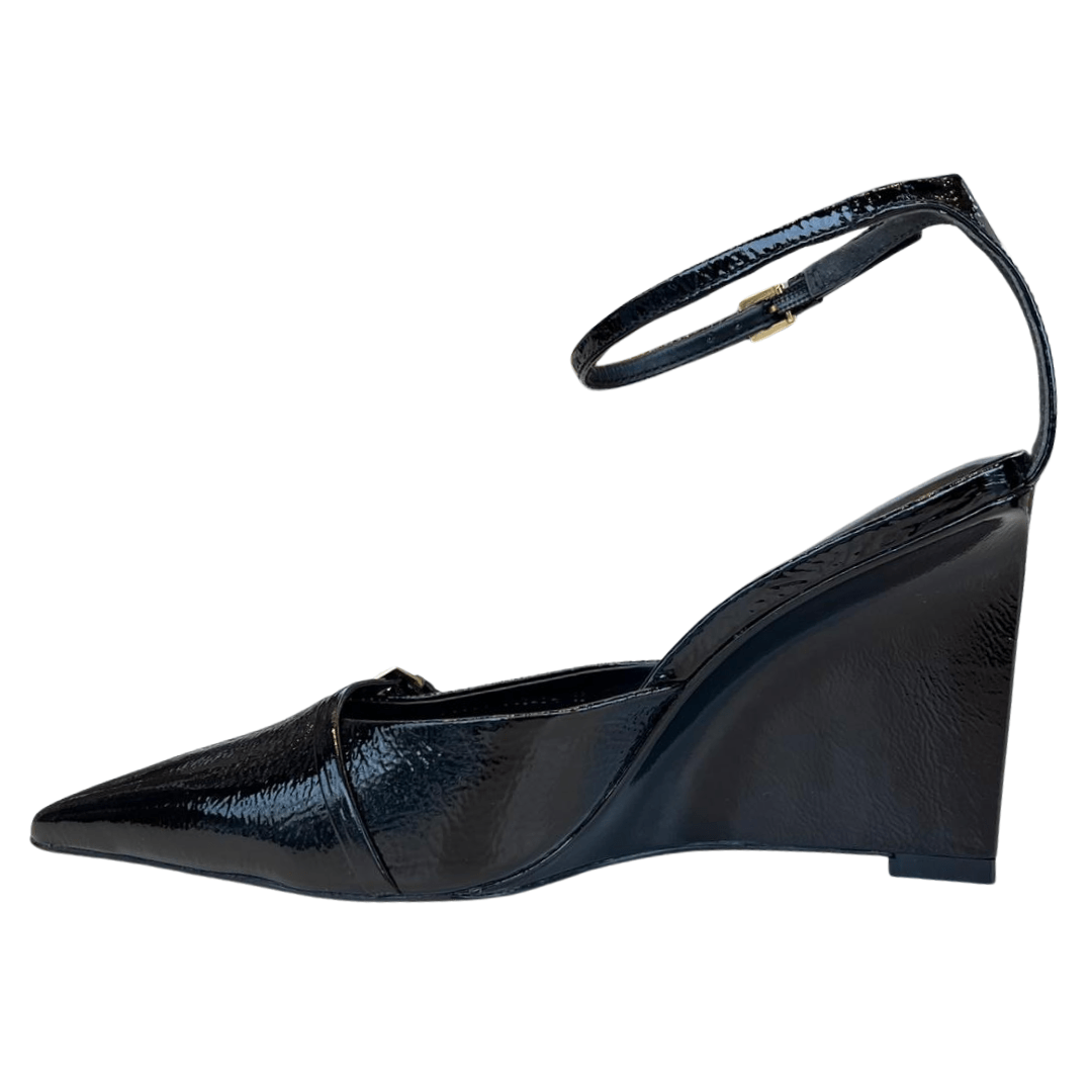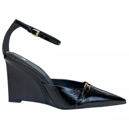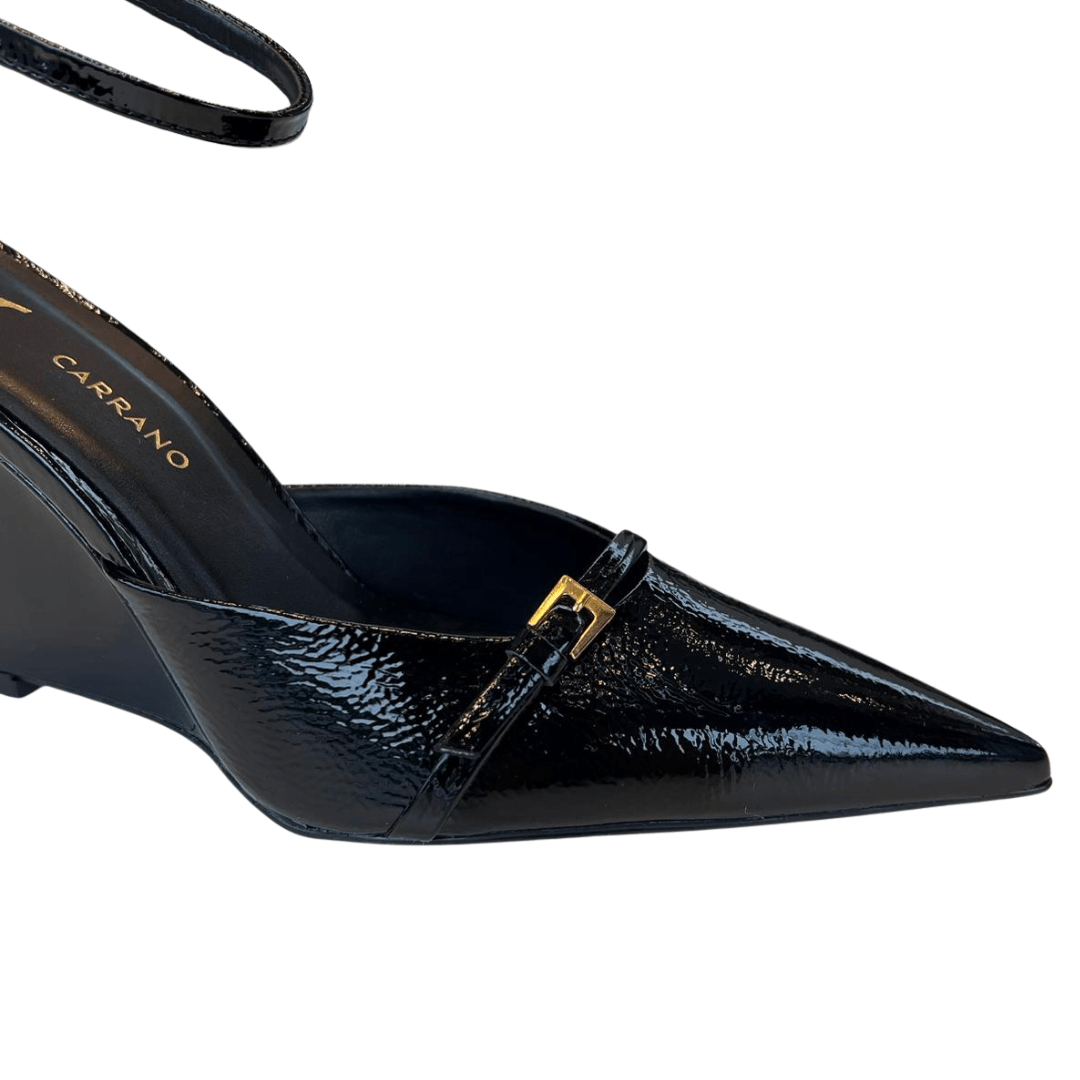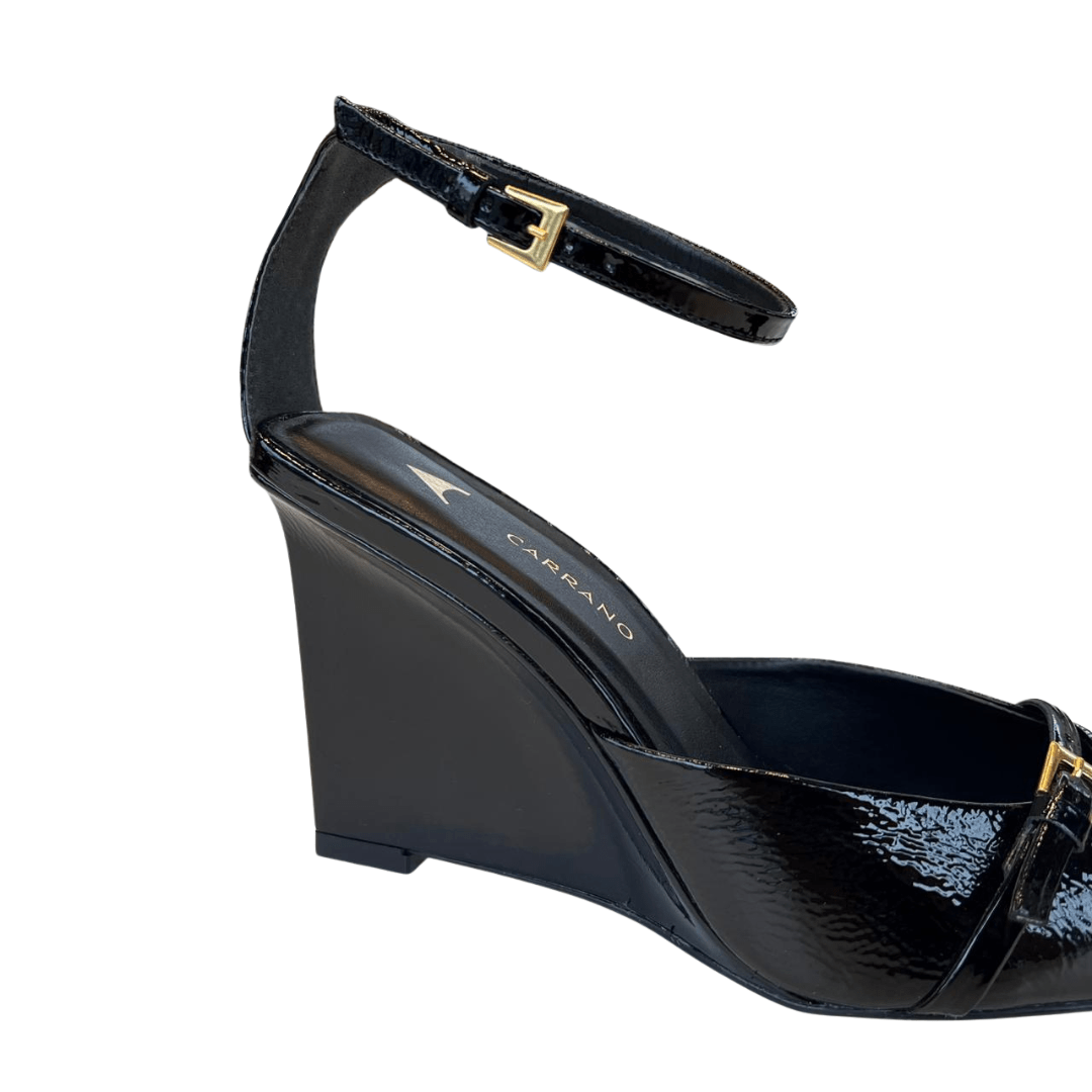 Não aceite o básico. Eleve o seu estilo com o design autêntico do Slingback Carrano Salto Anabela Preto Verniz. Adicione ao carrinho e prepare-se para ser o centro das atenções.