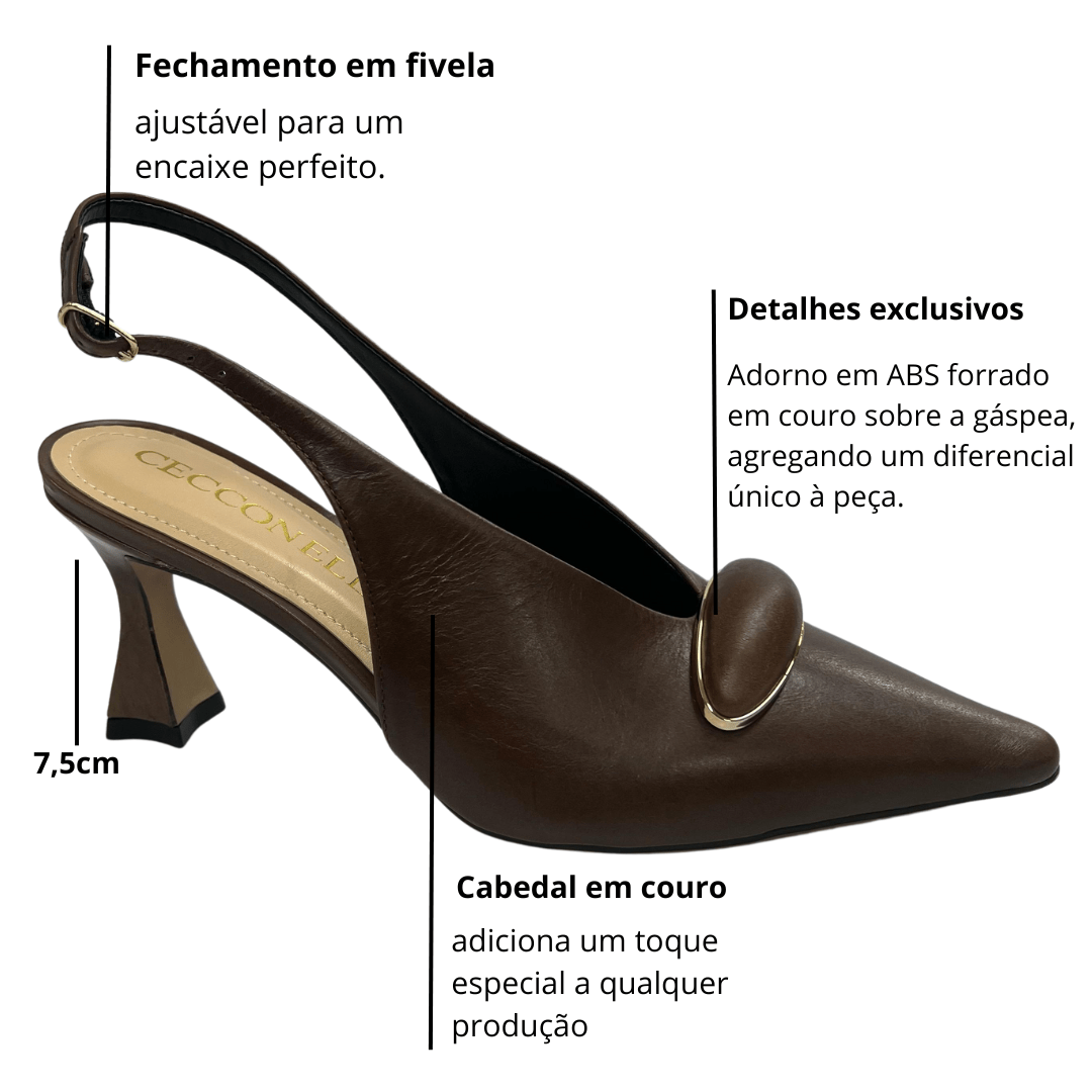 Modelo: Slingback Cecconello Feminino Salto Médio Marrom Couro