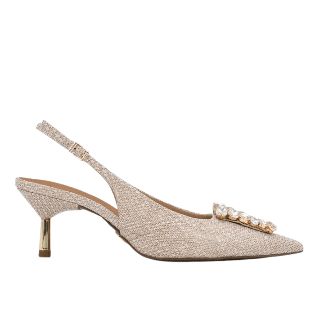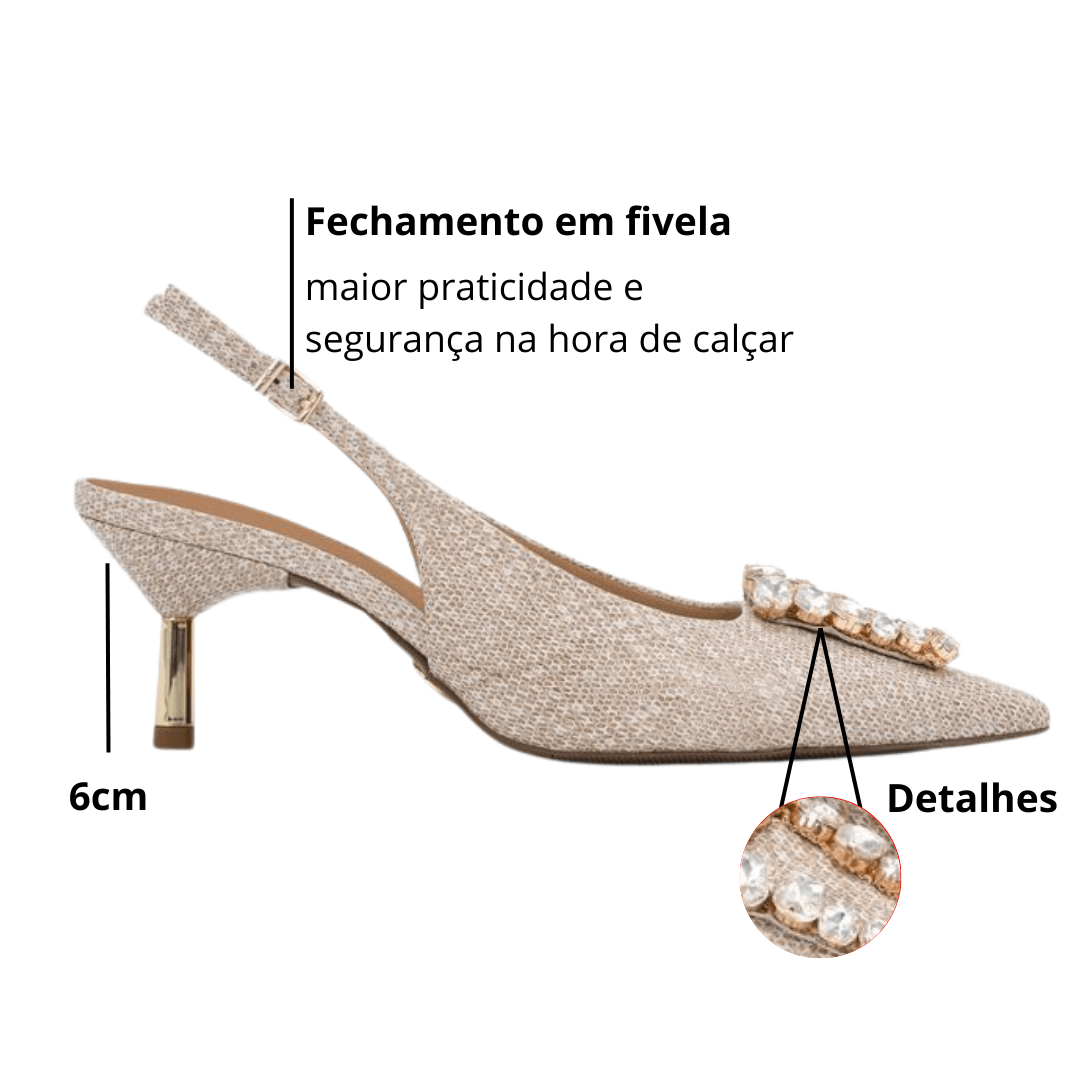 Fechamento: tira slingback ajustável com fivela no calcanhar.