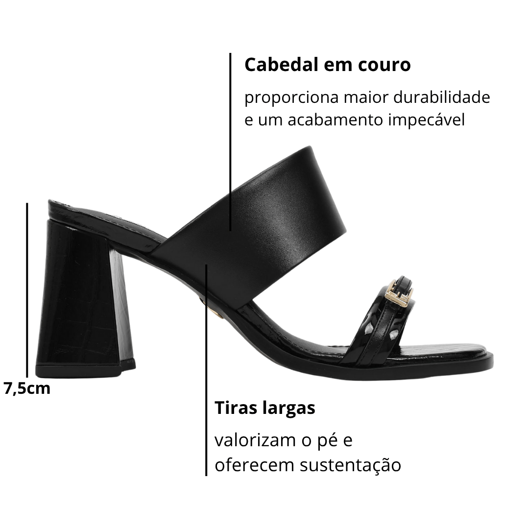 • Conforto e estabilidade: o salto bloco médio de 7,5 cm proporciona equilíbrio e bem-estar em cada passo.