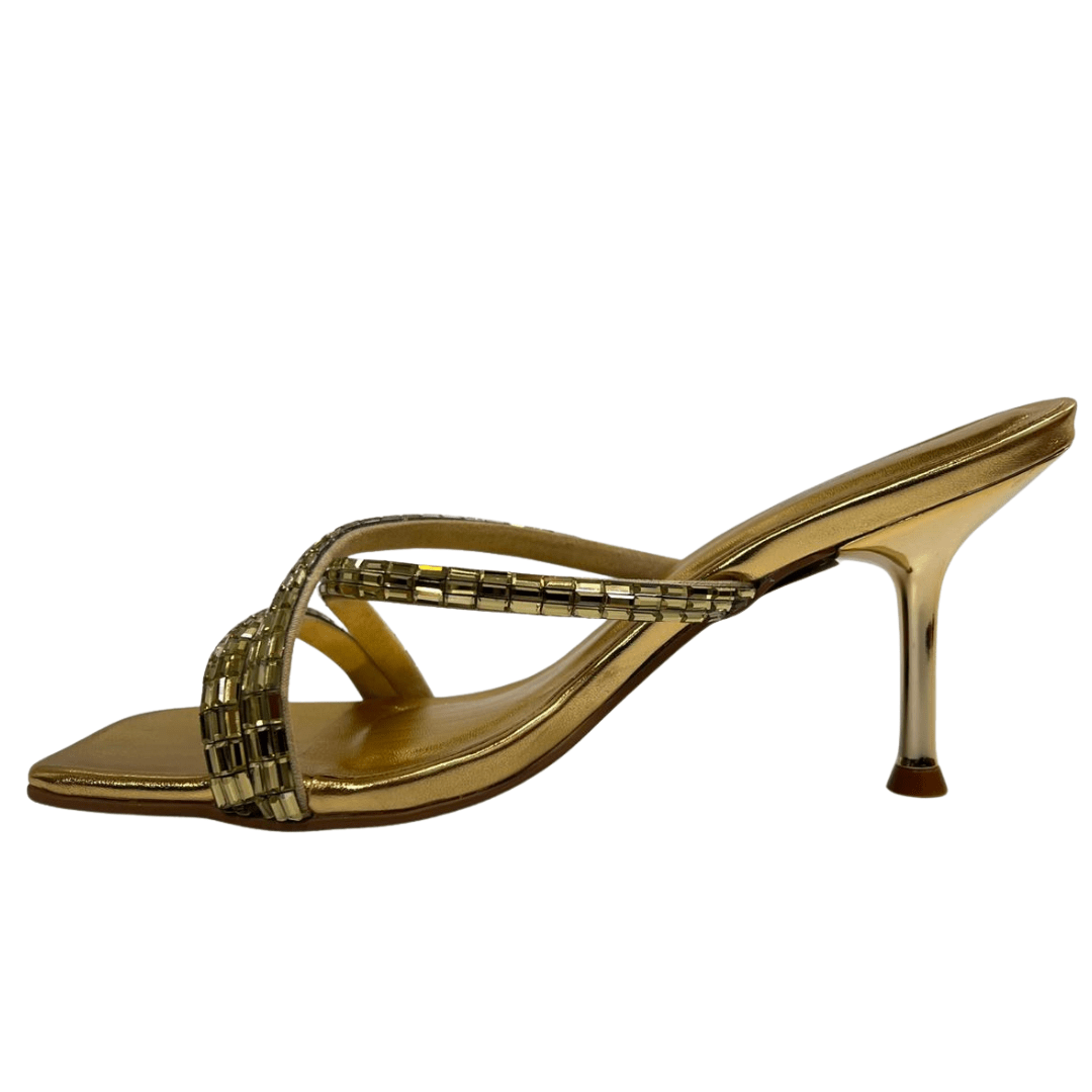Brilhe com elegância e personalidade com o Tamanco Lança Perfume Tiras Strass Salto Fino Ouro.