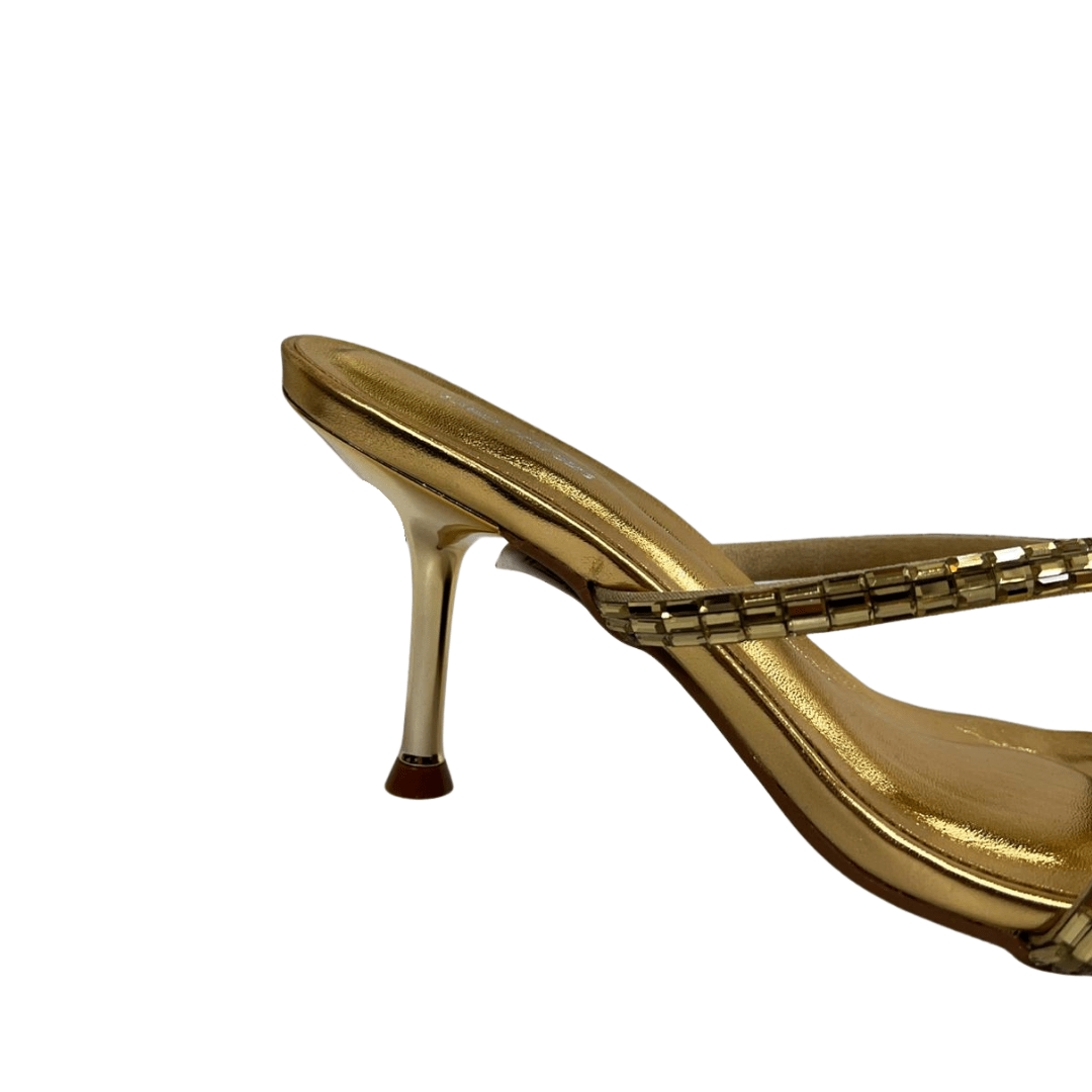 Tamanco Lança Perfume Feminino Tiras Strass Salto Fino Ouro