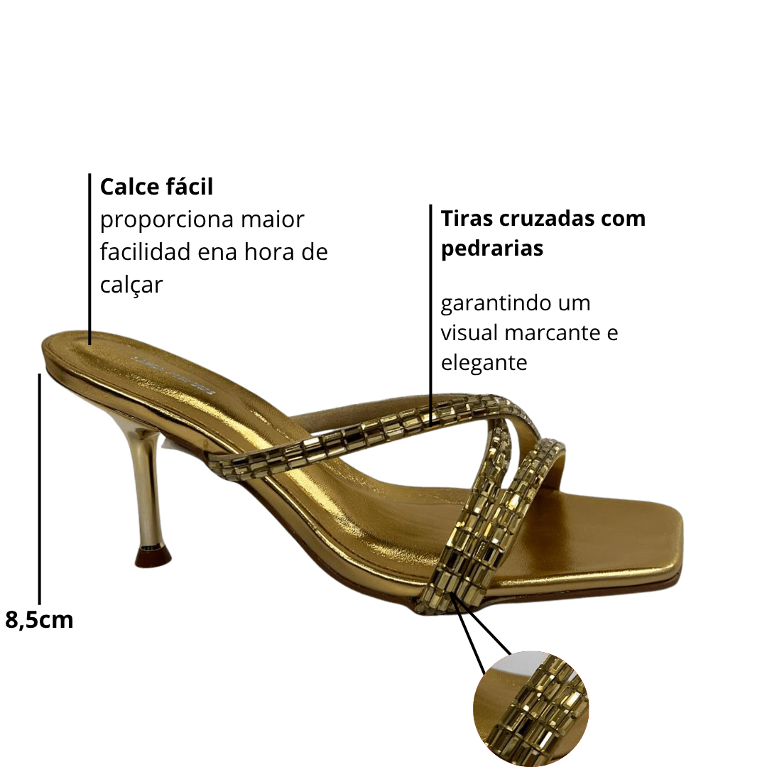 O Tamanco Lança Perfume Feminino Tiras Strass Salto Fino Ouroé sinônimo de sofisticação e atitude.
