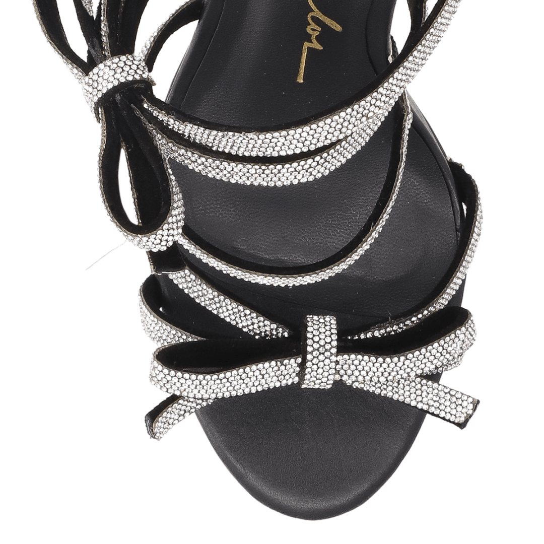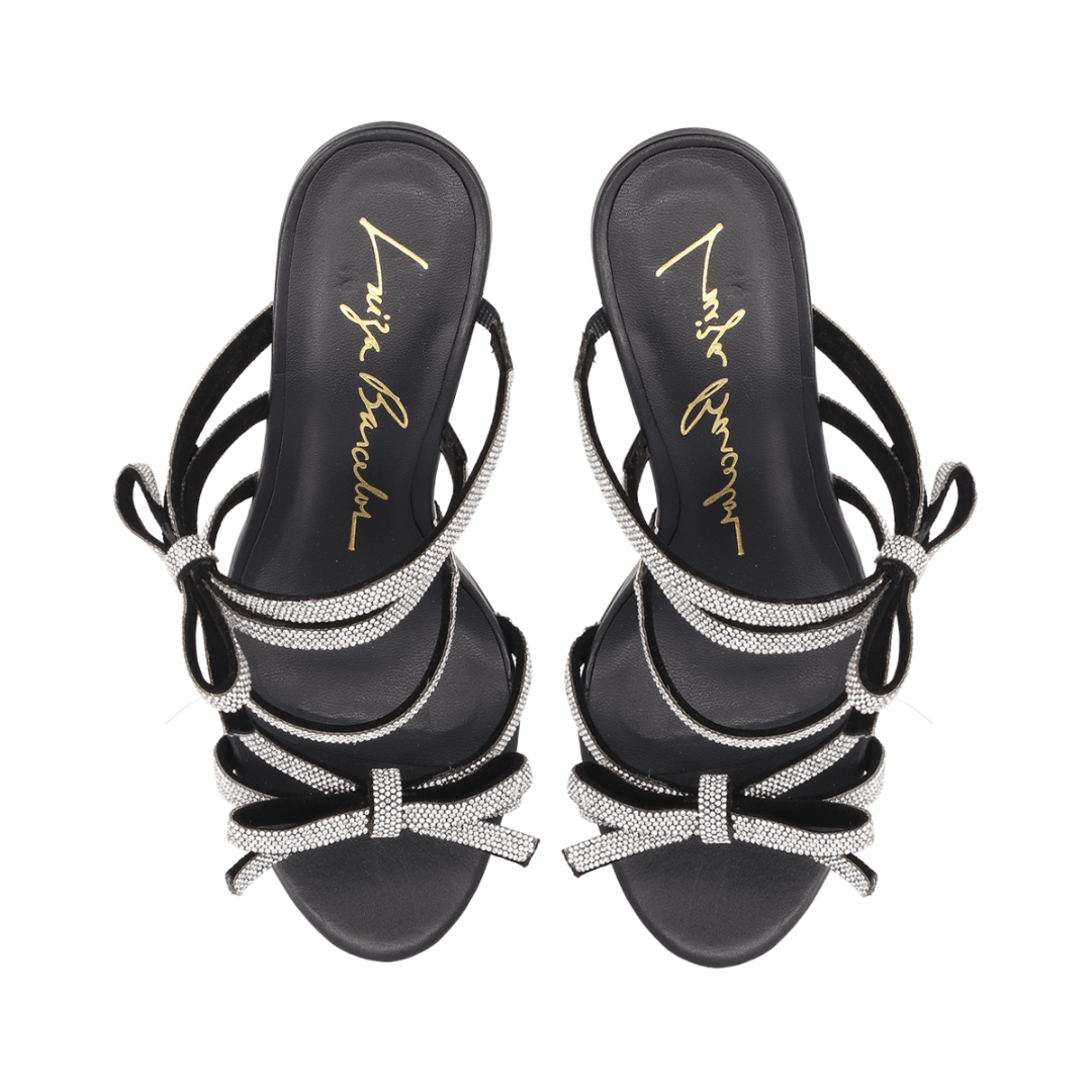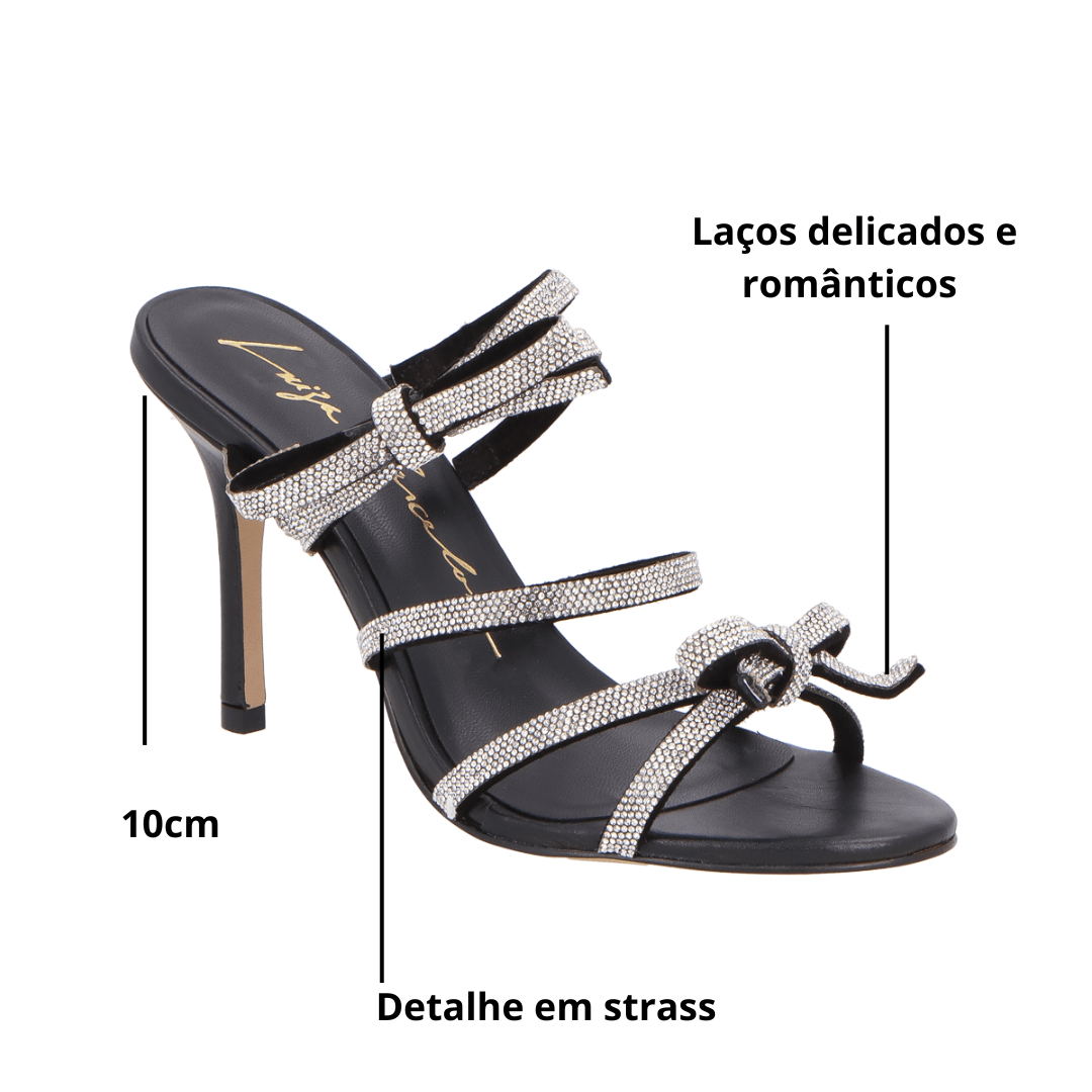 Adicione brilho, romantismo e sofisticação ao seu closet com o Tamanco Luiza Barcelos Feminino Preto Salto Alto Laços Strass.