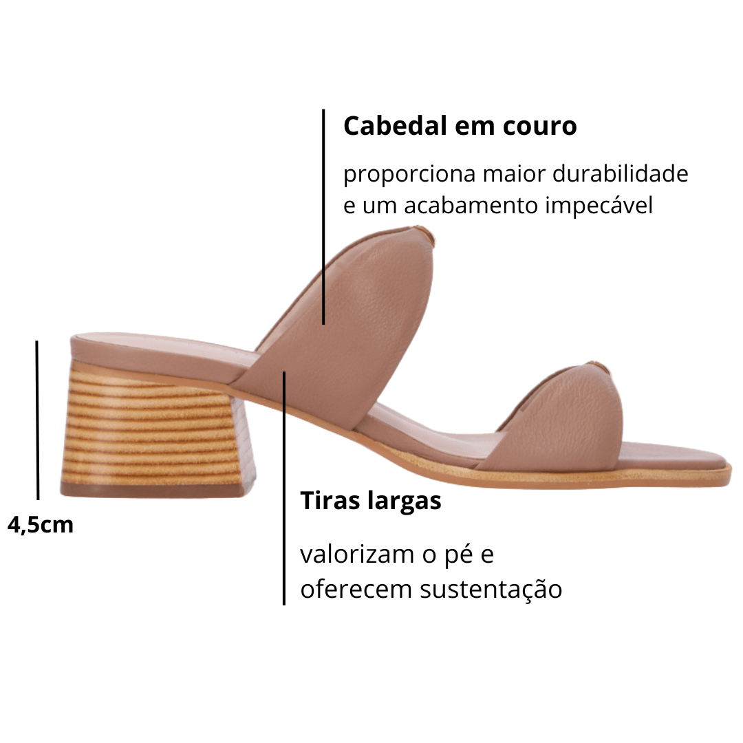 Estabilidade e segurança: salto bloco de 4,5 cm que proporciona equilíbrio e firmeza ao caminhar.