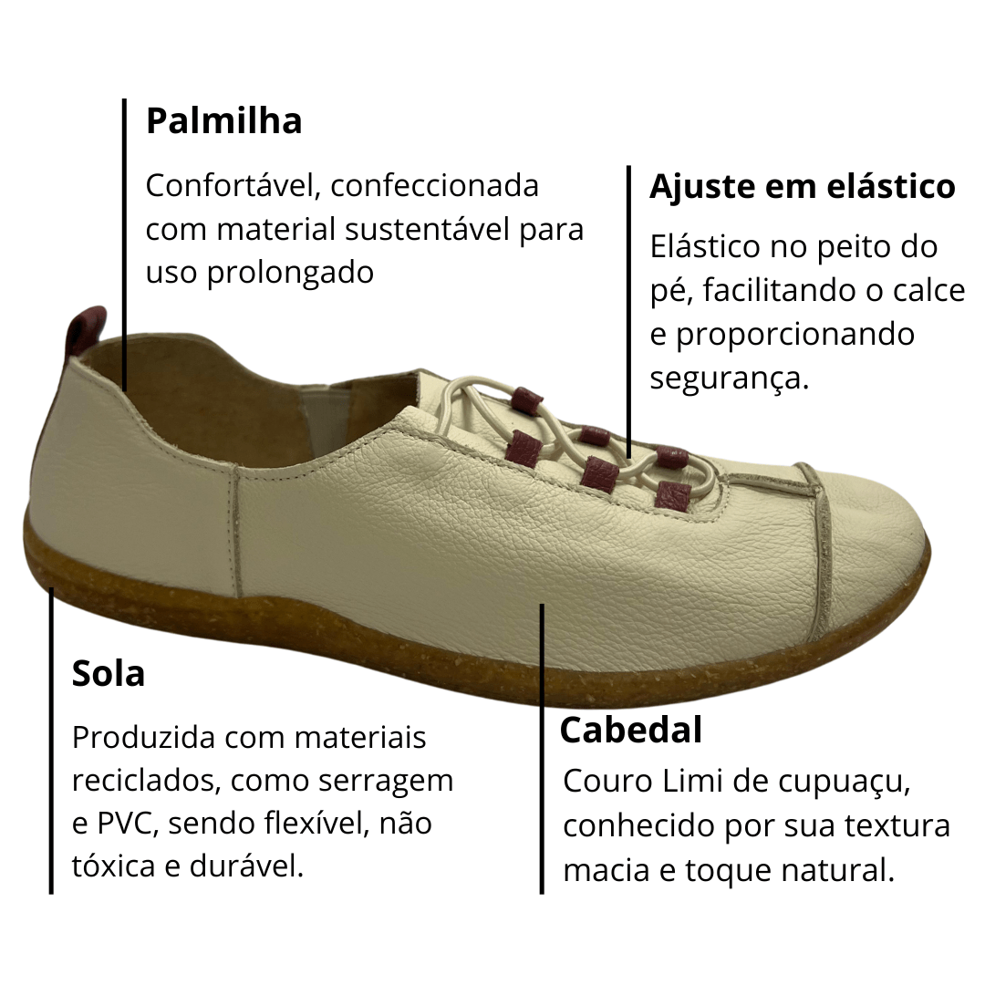- Durabilidade e leveza: Couro Limi de cupuaçu macio e natural aliado à sola flexível e resistente.
