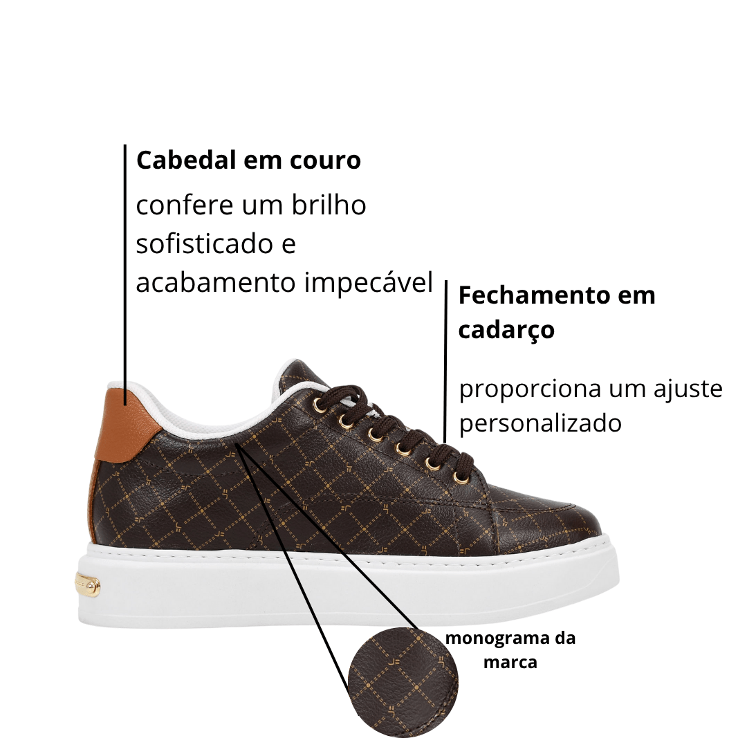 O tom marrom licor é uma aposta atemporal e sofisticada, enquanto a estampa exclusiva JB dourada acrescenta um toque de luxo sutil, característico da marca. Além do visual refinado, o conforto do solado leve e a praticidade do fechamento por cadarços tornam o modelo perfeito para o dia a dia com muito estilo.