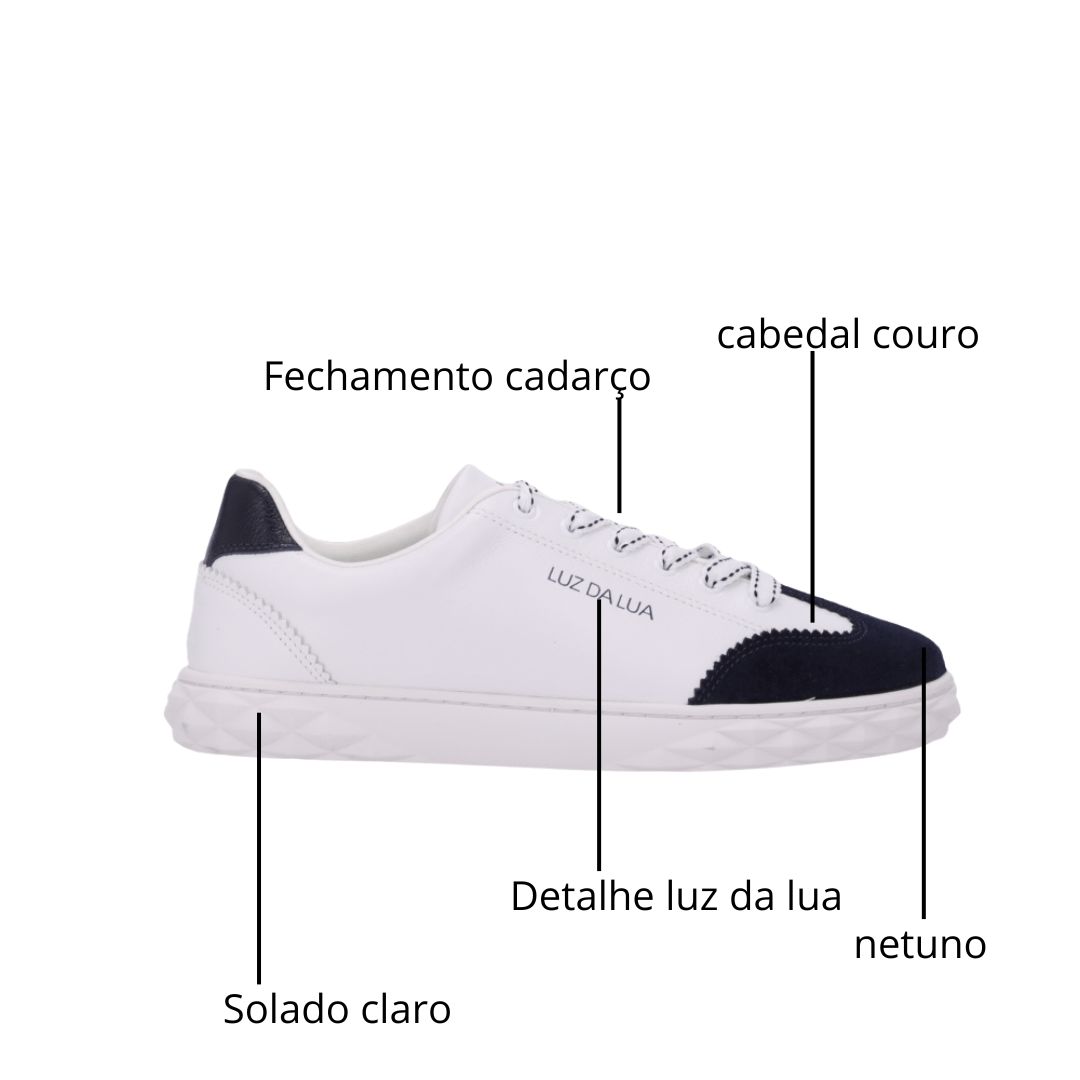 O Tênis Luz da Lua Branco Netuno Camurça une o charme do couro legítimo ao toque macio da camurça, entregando um visual contemporâneo e cheio de personalidade. A combinação do branco com o azul netuno cria um contraste elegante, enquanto o solado claro e os detalhes da marca garantem autenticidade ao modelo.