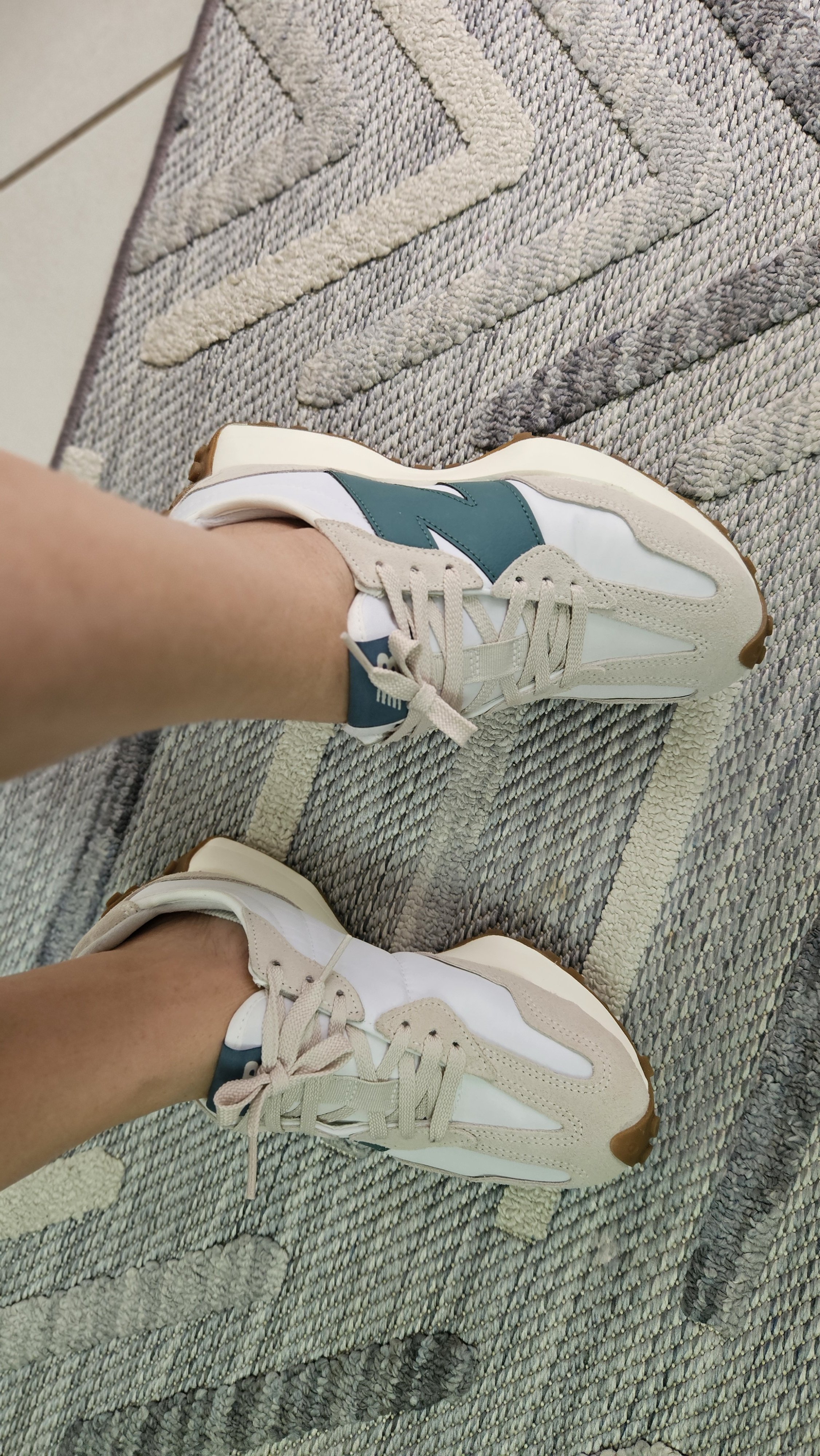 Modelo: Tênis New Balance Feminino 327 Branco Off Verde Escuro